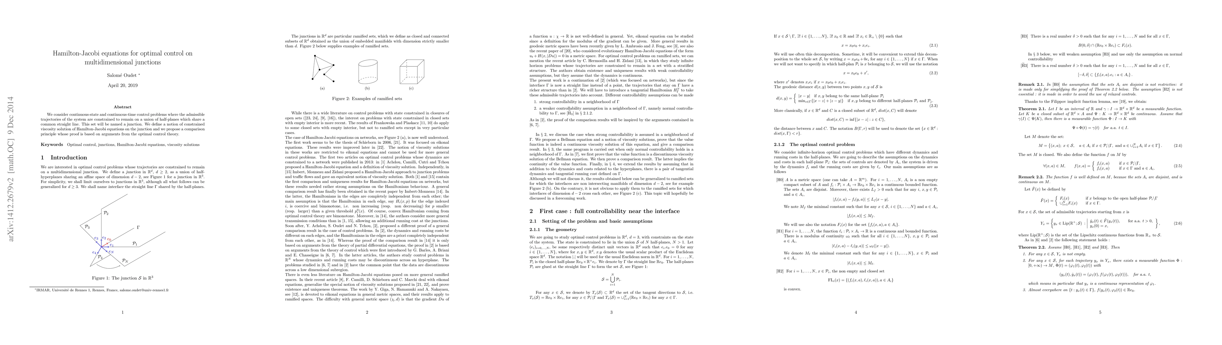 This paper studies optimal control problems on multidimensional junctions, defining constrained viscosity solutions for Hamilton-Jacobi equations and proving a comparison principle using optimal control theory. The focus is on trajectories constrained to remain on intersecting half-planes.