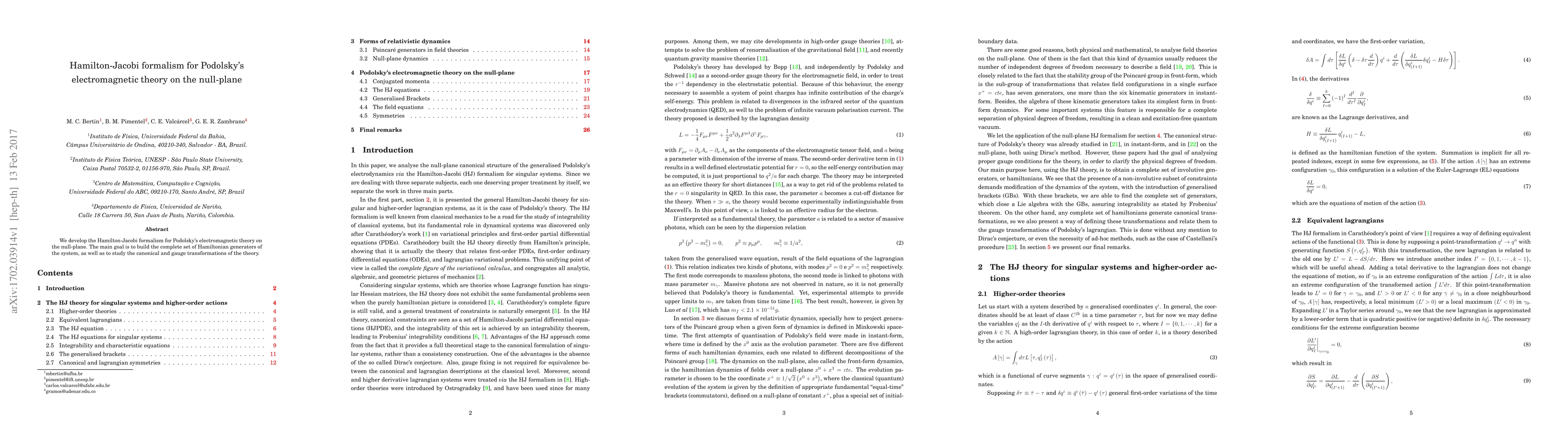 We develop the Hamilton-Jacobi formalism for Podolsky's electromagnetic theory on the null-plane. The main goal is to build the complete set of Hamiltonian generators of the system, as well as to study the canonical and gauge transformations of the theory.