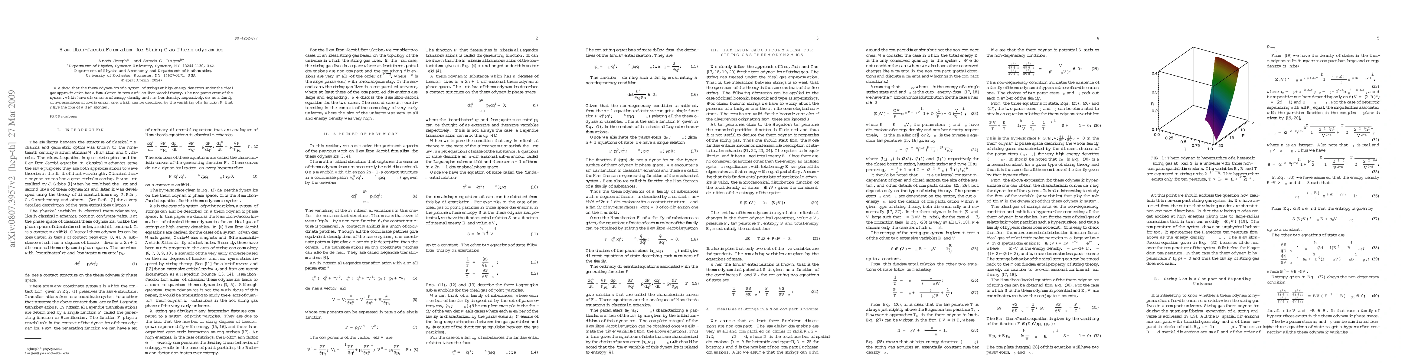 The paper demonstrates that string gas thermodynamics can be formulated using Hamilton-Jacobi theory, with the system's energy density and number density defining hypersurfaces described by a vanishing Hamiltonian function F. This approach provides a novel perspective on high-energy string systems.