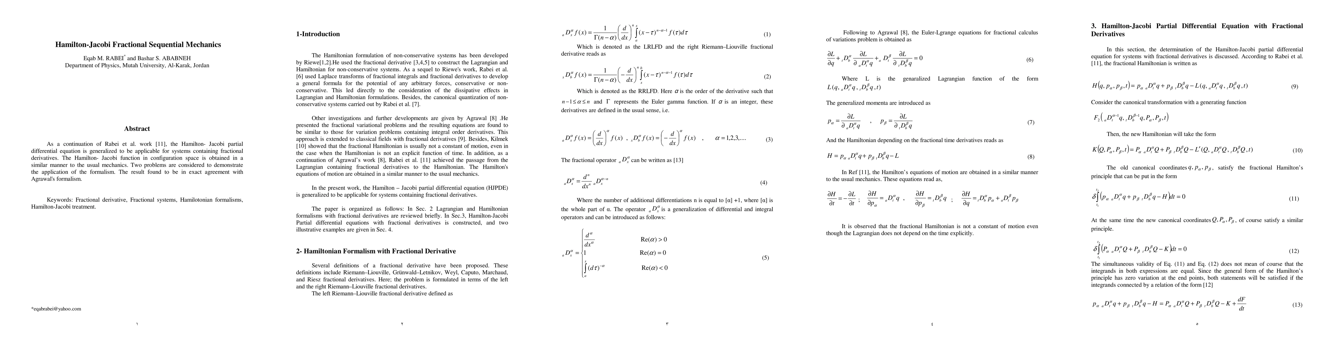 This paper extends the Hamilton-Jacobi equation to incorporate fractional derivatives, demonstrating its application through two problems and confirming results align with Agrawal's formalism. The approach mirrors traditional mechanics but adapts to fractional systems.
