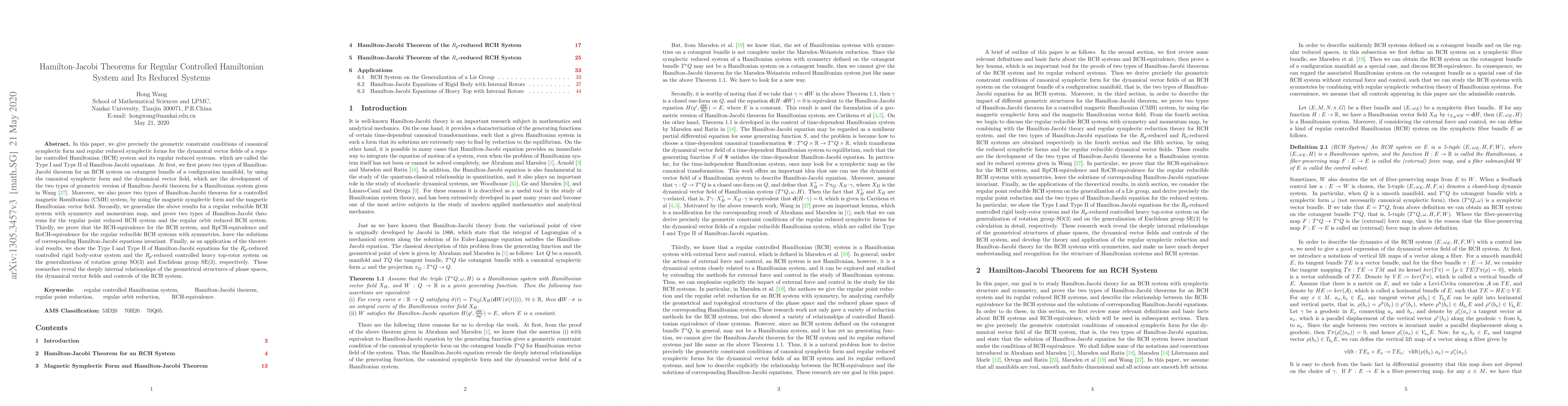 This paper proves Hamilton-Jacobi theorems for regular controlled Hamiltonian systems and their reduced forms, establishing geometric constraint conditions for dynamical vector fields. It also demonstrates invariance of solutions under equivalence relations and applies these results to controlled rigid body-rotor and heavy top-rotor systems.