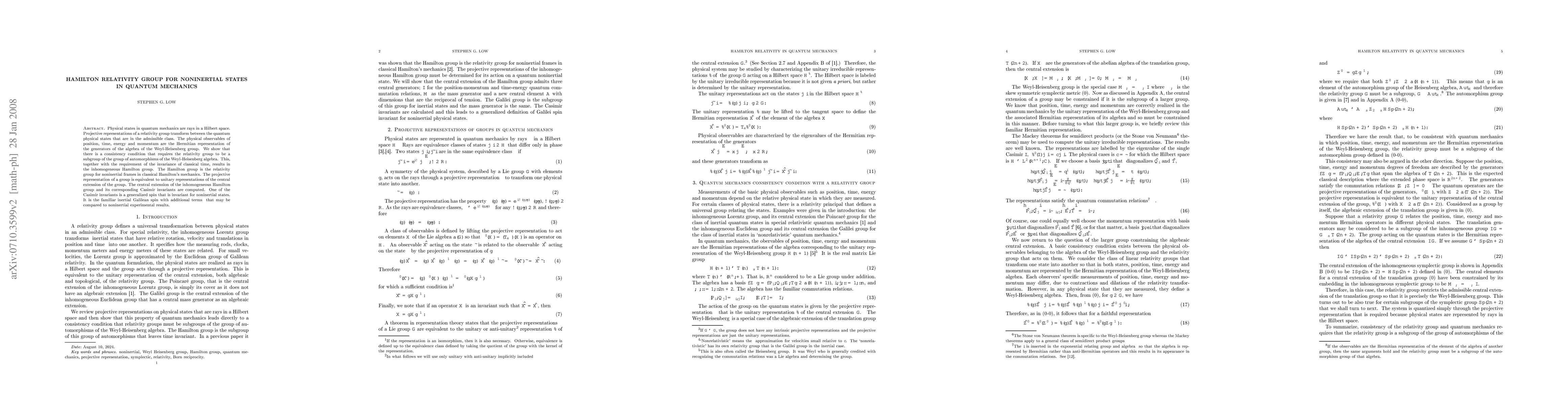 This paper explores the Hamilton relativity group for noninertial states in quantum mechanics, demonstrating that the group is a subgroup of the automorphisms of the Weyl-Heisenberg algebra. It computes the central extension of the inhomogeneous Hamilton group and identifies a generalized spin invariant for noninertial states, extending the inertial Galilean spin.