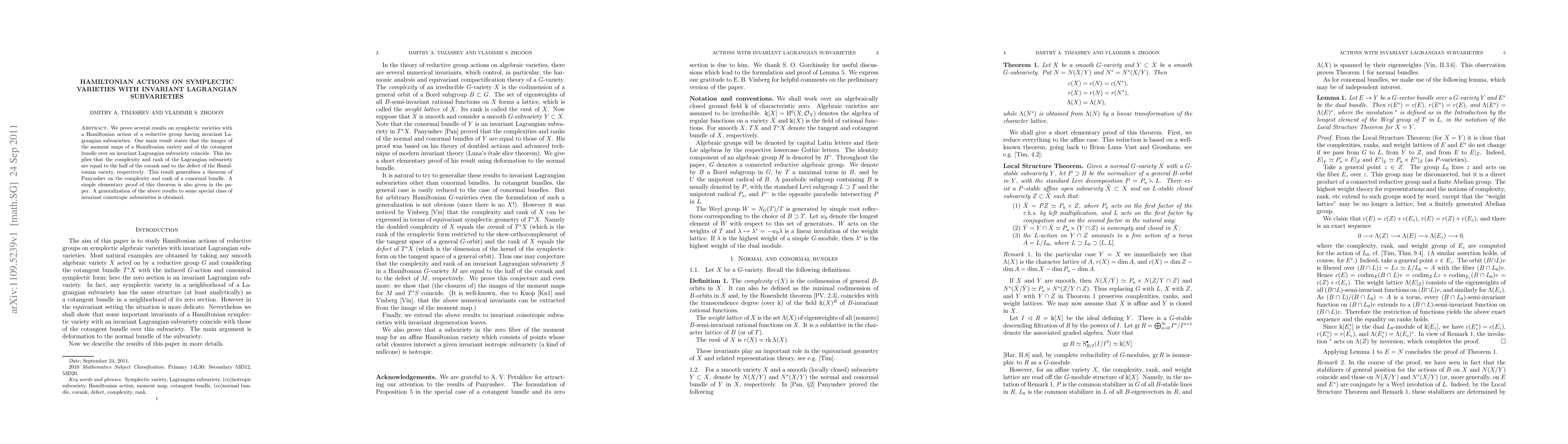 We prove several results on symplectic varieties with a Hamiltonian action of a reductive group having invariant Lagrangian subvarieties. Our main result states that the images of the moment maps of a Hamiltonian variety and of the cotangent bundle over an invariant Lagrangian subvariety coincide. This implies that the complexity and rank of the Lagrangian subvariety are equal to the half of the corank and to the defect of the Hamiltonian variety, respectively. This result generalizes a theorem of Panyushev on the complexity and rank of a conormal bundle. A simple elementary proof of this theorem is also given in the paper. A generalization of the above results to some special class of invariant coisotropic subvarieties is obtained.