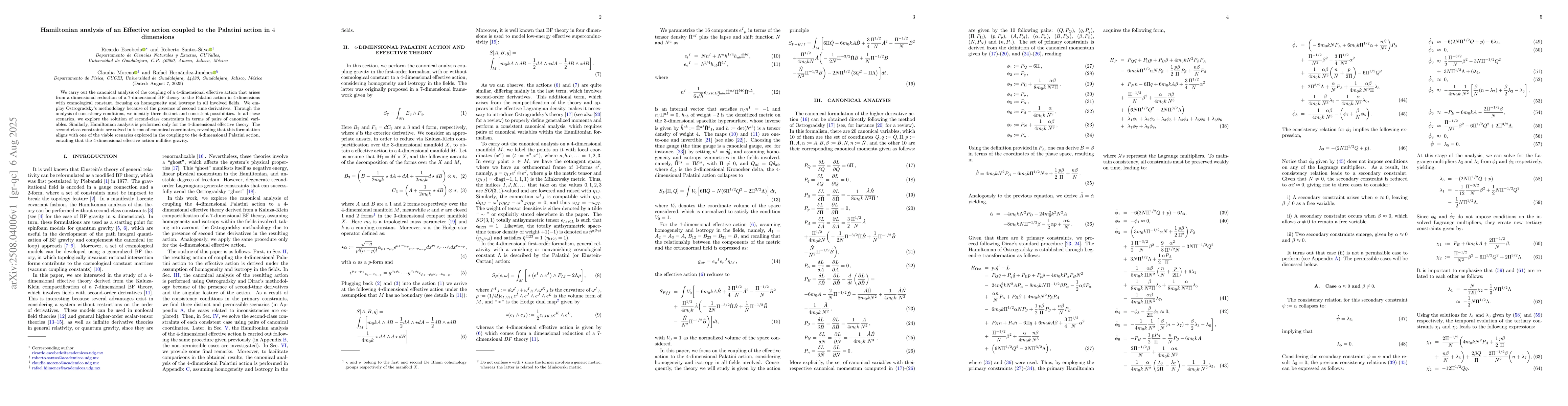 We carry out the canonical analysis of the coupling of a $4$-dimensional effective action that arises from a dimensional reduction of a $7$-dimensional BF theory to the Palatini action in $4$-dimensions with cosmological constant, focusing on homogeneity and isotropy in all involved fields. We employ Ostrogradsky's methodology because of the presence of second time derivatives. Through the analysis of consistency conditions, we identify three distinct and consistent possibilities. In all these scenarios, we explore the solution of second-class constraints in terms of pairs of canonical variables. Similarly, Hamiltonian analysis is performed only for the $4$-dimensional effective theory. The second-class constraints are solved in terms of canonical coordinates, revealing that this formulation aligns with one of the viable scenarios explored in the coupling to the $4$-dimensional Palatini action, entailing that the $4$-dimensional effective action nullifies gravity.