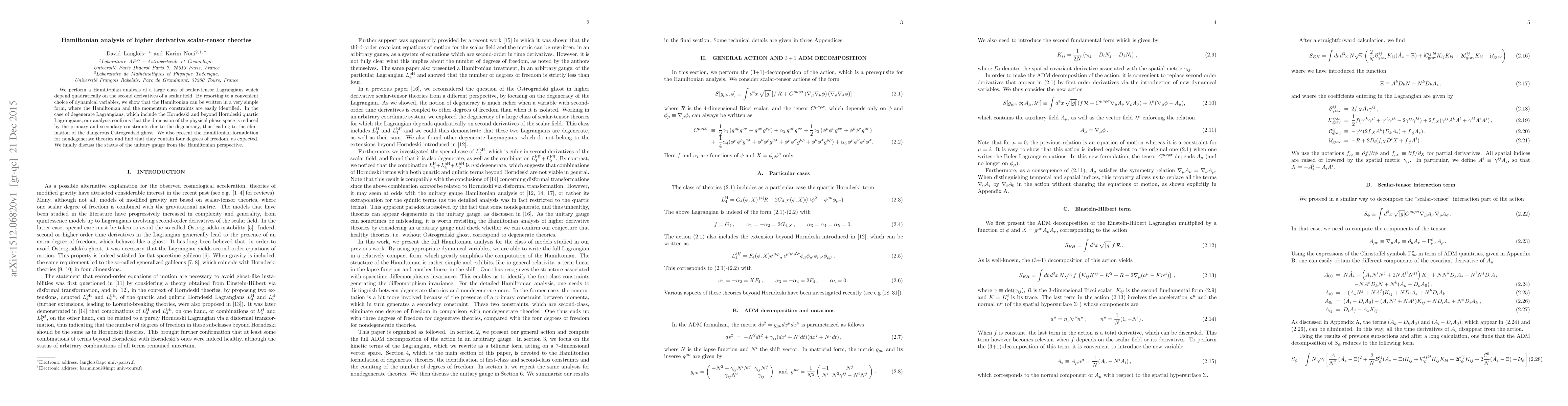 We perform a Hamiltonian analysis of a large class of scalar-tensor Lagrangians which depend quadratically on the second derivatives of a scalar field. By resorting to a convenient choice of dynamical variables, we show that the Hamiltonian can be written in a very simple form, where the Hamiltonian and the momentum constraints are easily identified. In the case of degenerate Lagrangians, which include the Horndeski and beyond Horndeski quartic Lagrangians, our analysis confirms that the dimension of the physical phase space is reduced by the primary and secondary constraints due to the degeneracy, thus leading to the elimination of the dangerous Ostrogradski ghost. We also present the Hamiltonian formulation for nondegenerate theories and find that they contain four degrees of freedom, as expected. We finally discuss the status of the unitary gauge from the Hamiltonian perspective.