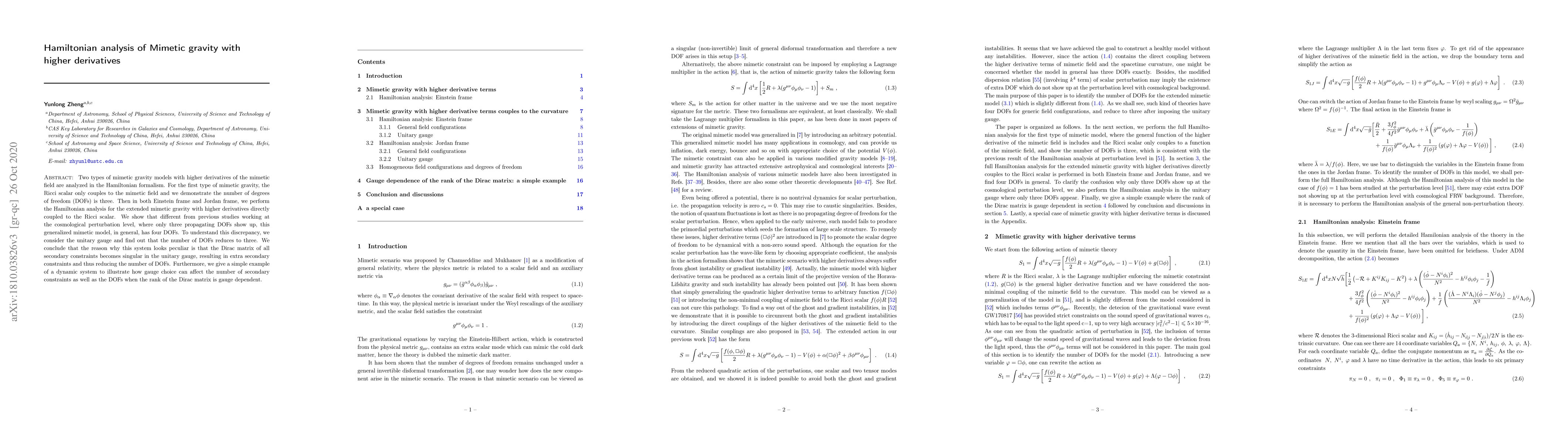 This paper analyzes two types of mimetic gravity models with higher derivatives using Hamiltonian formalism, finding that the extended model generally has four degrees of freedom (DOFs) instead of the usual three. The discrepancy arises due to the singular Dirac matrix in the unitary gauge, which introduces extra secondary constraints, reducing DOFs to three.