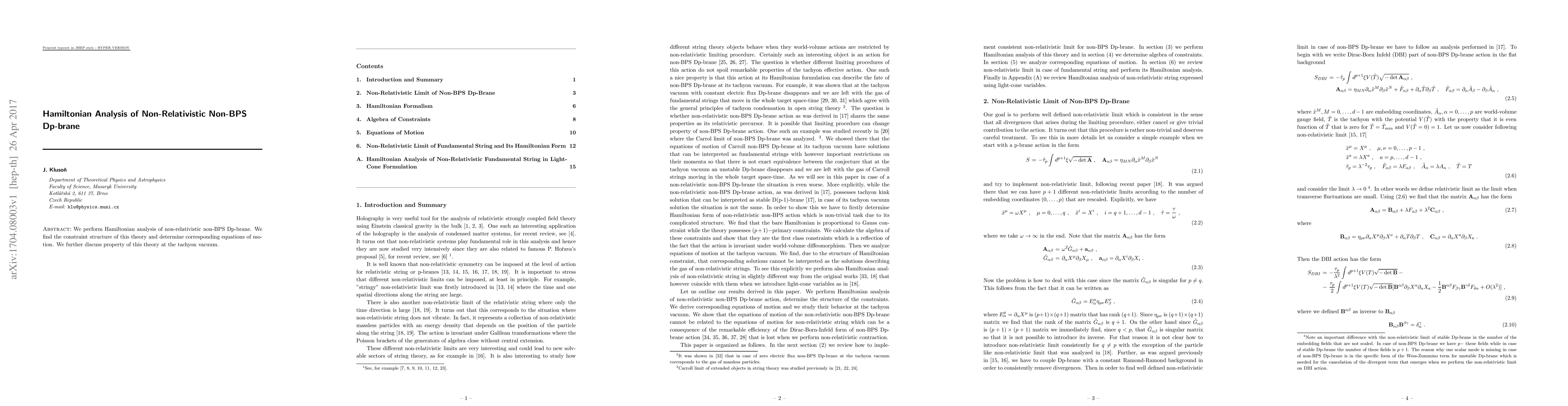 The paper conducts a Hamiltonian analysis of non-relativistic non-BPS Dp-branes, identifying the constraint structure and deriving the equations of motion, while also examining properties at the tachyon vacuum.