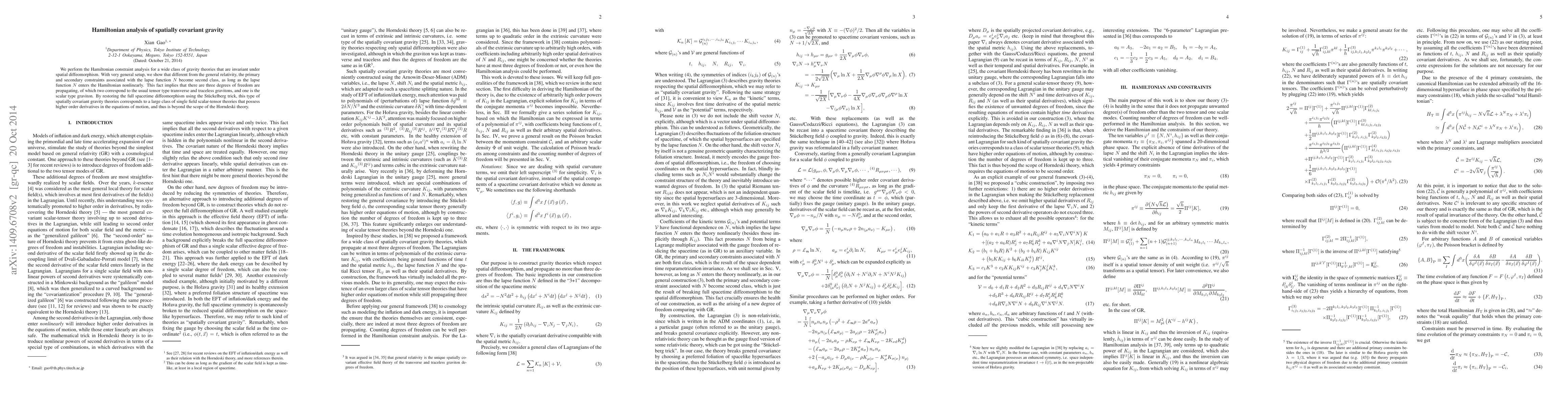 This paper conducts a Hamiltonian constraint analysis for spatially covariant gravity theories invariant under spatial diffeomorphisms, revealing that nonlinear lapse functions lead to second-class constraints, resulting in three propagating degrees of freedom, including a scalar graviton. The theories extend beyond Horndeski's framework due to higher-order derivatives in the equations of motion.