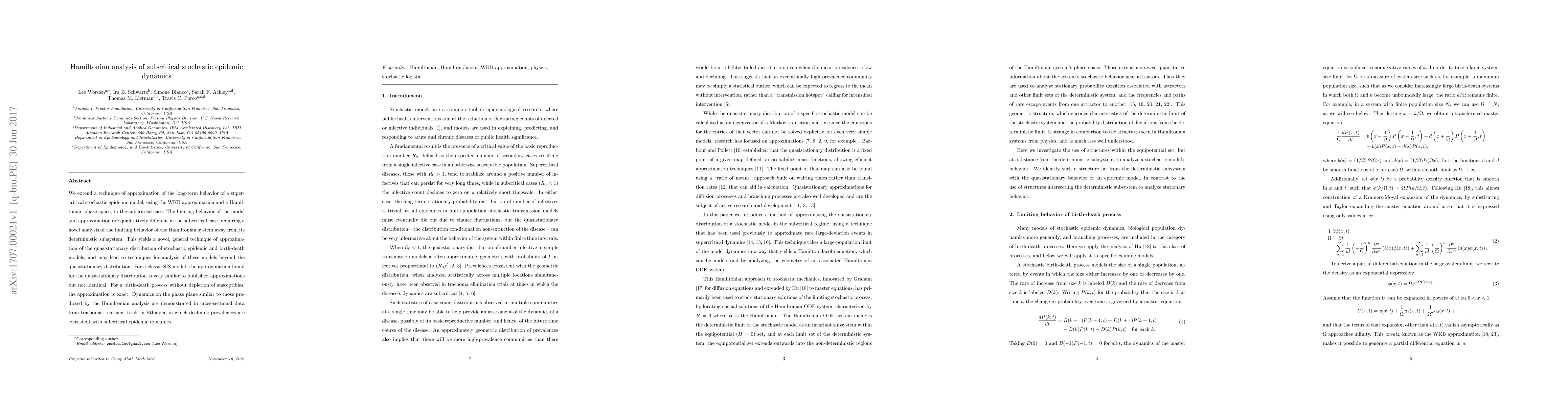 The paper presents a Hamiltonian phase space analysis for subcritical stochastic epidemic dynamics, introducing a novel method for approximating quasi-stationary distributions in such systems.