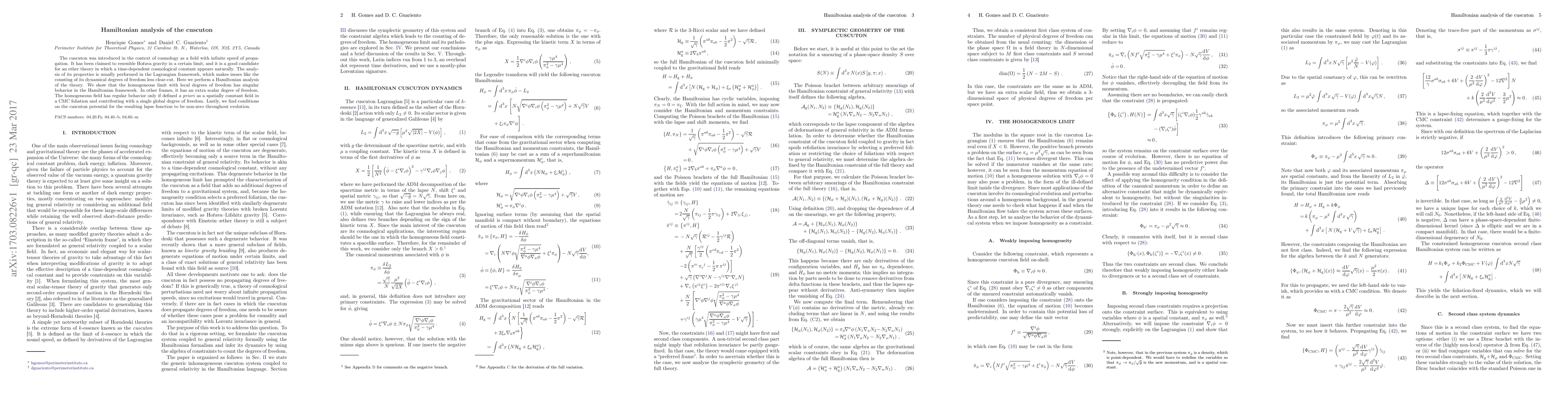 The Hamiltonian formulation of the cuscuton field, including constraint algebra computation and analysis of homogeneous and strong homogeneity implications.