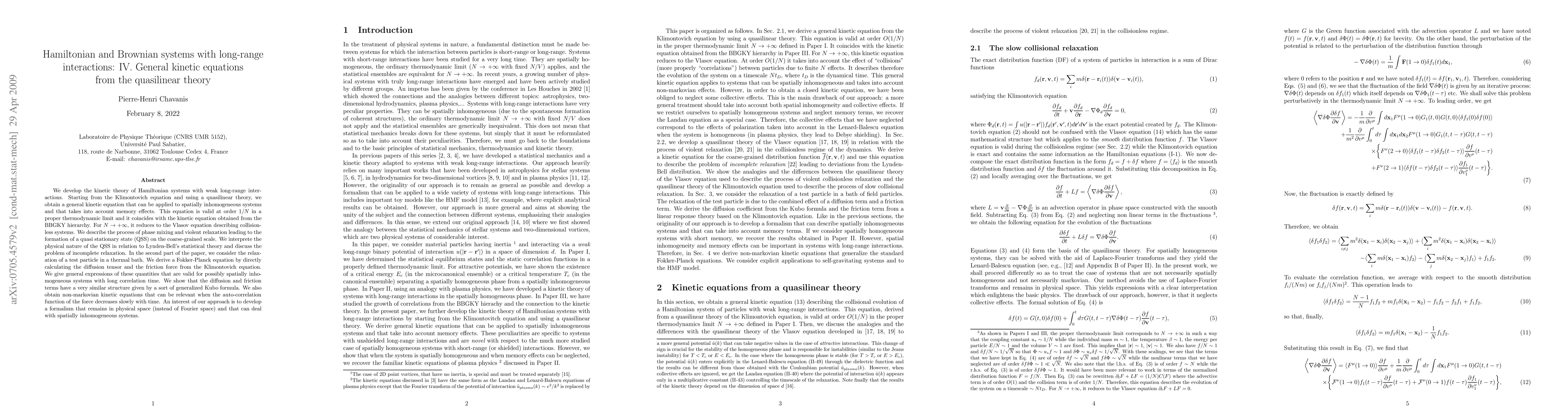 We develop the kinetic theory of Hamiltonian systems with weak long-range interactions. Starting from the Klimontovich equation and using a quasilinear theory, we obtain a general kinetic equation that can be applied to spatially inhomogeneous systems and that takes into account memory effects. This equation is valid at order 1/N in a proper thermodynamic limit and it coincides with the kinetic equation obtained from the BBGKY hierarchy. For N tending to infinity, it reduces to the Vlasov equation describing collisionless systems. We describe the process of phase mixing and violent relaxation leading to the formation of a quasi stationary state (QSS) on the coarse-grained scale. We interprete the physical nature of the QSS in relation to Lynden-Bell's statistical theory and discuss the problem of incomplete relaxation. In the second part of the paper, we consider the relaxation of a test particle in a thermal bath. We derive a Fokker-Planck equation by directly calculating the diffusion tensor and the friction force from the Klimontovich equation. We give general expressions of these quantities that are valid for possibly spatially inhomogeneous systems with long correlation time. We show that the diffusion and friction terms have a very similar structure given by a sort of generalized Kubo formula. We also obtain non-markovian kinetic equations that can be relevant when the auto-correlation function of the force decreases slowly with time. An interest of our approach is to develop a formalism that remains in physical space (instead of Fourier space) and that can deal with spatially inhomogeneous systems.