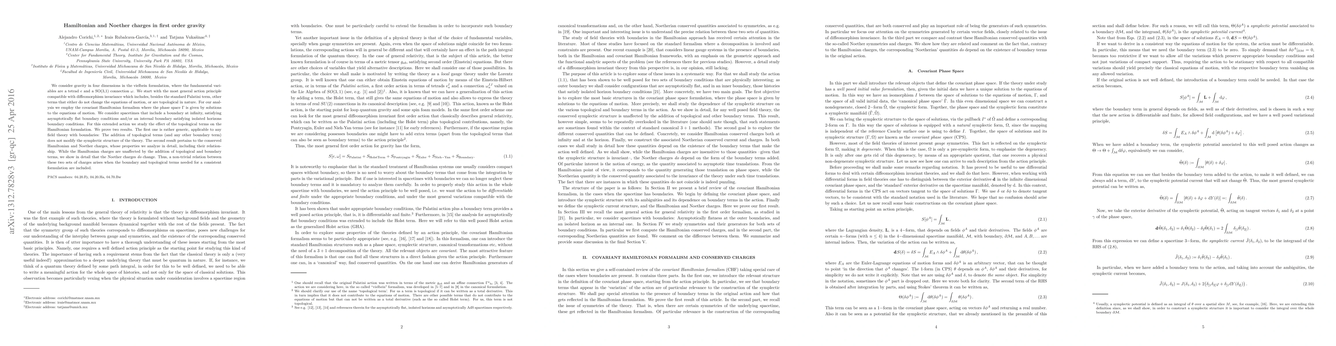 We consider gravity in four dimensions in the vielbein formulation, where the fundamental variables are a tetrad $e$ and a SO(3,1) connection $\omega$. We start with the most general action principle compatible with diffeomorphism invariance which includes, besides the standard Palatini term, other terms that either do not change the equations of motion, or are topological in nature. For our analysis we employ the covariant Hamiltonian formalism where the phase space $\Gamma$ is given by solutions to the equations of motion. We consider spacetimes that include a boundary at infinity, satisfying asymptotically flat boundary conditions and/or an internal boundary satisfying isolated horizons boundary conditions. For this extended action we study the effect of the topological terms on the Hamiltonian formulation. We prove two results. The first one is rather generic, applicable to any field theory with boundaries: The addition of topological terms (and any other boundary term) does not modify the symplectic structure of the theory. The second result pertains to the conserved Hamiltonian and Noether charges, whose properties we analyze in detail, including their relationship. While the Hamiltonian charges are unaffected by the addition of topological and boundary terms, we show in detail that the Noether charges {\em do} change. Thus, a non-trivial relation between these two sets of charges arises when the boundary and topological terms needed for a consistent formulation are included.