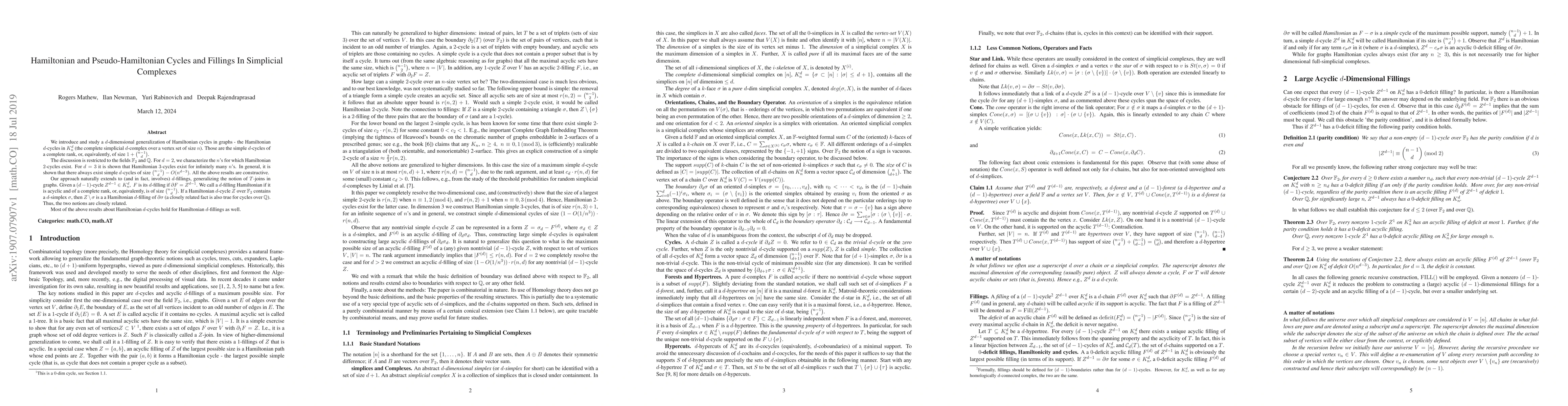 This paper generalizes Hamiltonian cycles to $d$-dimensional Hamiltonian $d$-cycles in complete simplicial $d$-complexes $K_n^d$. It characterizes the existence of these cycles for various dimensions and fields, showing that they exist for infinitely many $n$ when $d=3$. The study also extends to $d$-fillings, establishing their relationship with Hamiltonian $d$-cycles.