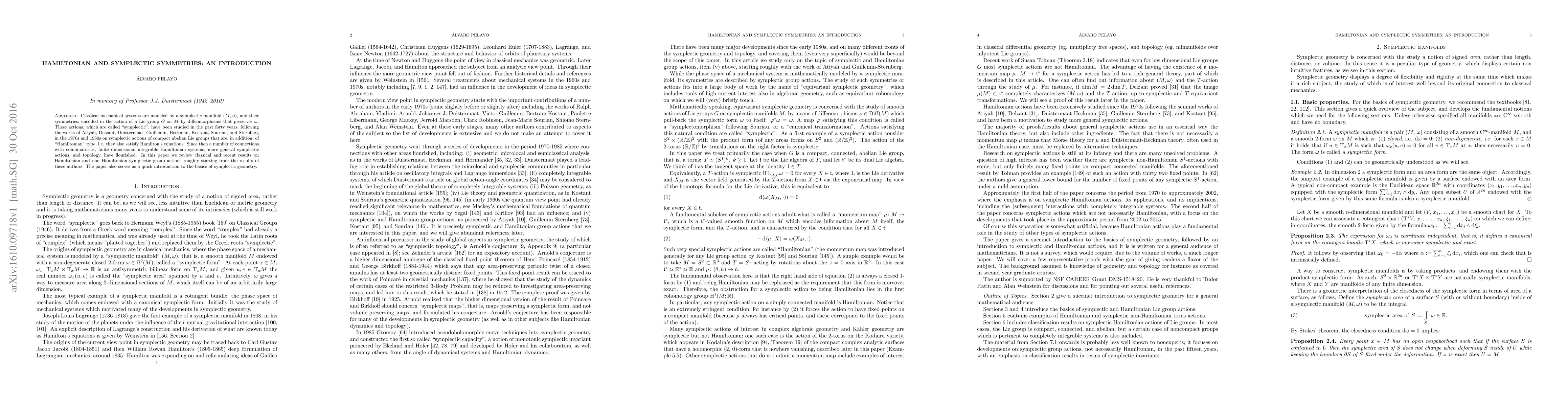 Classical mechanical systems are modeled by a symplectic manifold $(M,\omega)$, and their symmetries, encoded in the action of a Lie group $G$ on $M$ by diffeomorphisms that preserves $\omega$. These actions, which are called "symplectic", have been studied in the past forty years, following the works of Atiyah, Delzant, Duistermaat, Guillemin, Heckman, Kostant, Souriau, and Sternberg in the 1970s and 1980s on symplectic actions of compact abelian Lie groups that are, in addition, of "Hamiltonian" type, i.e. they also satisfy Hamilton's equations. Since then a number of connections with combinatorics, finite dimensional integrable Hamiltonian systems, more general symplectic actions, and topology, have flourished. In this paper we review classical and recent results on Hamiltonian and non Hamiltonian symplectic group actions roughly starting from the results of these authors. The paper also serves as a quick introduction to the basics of symplectic geometry.