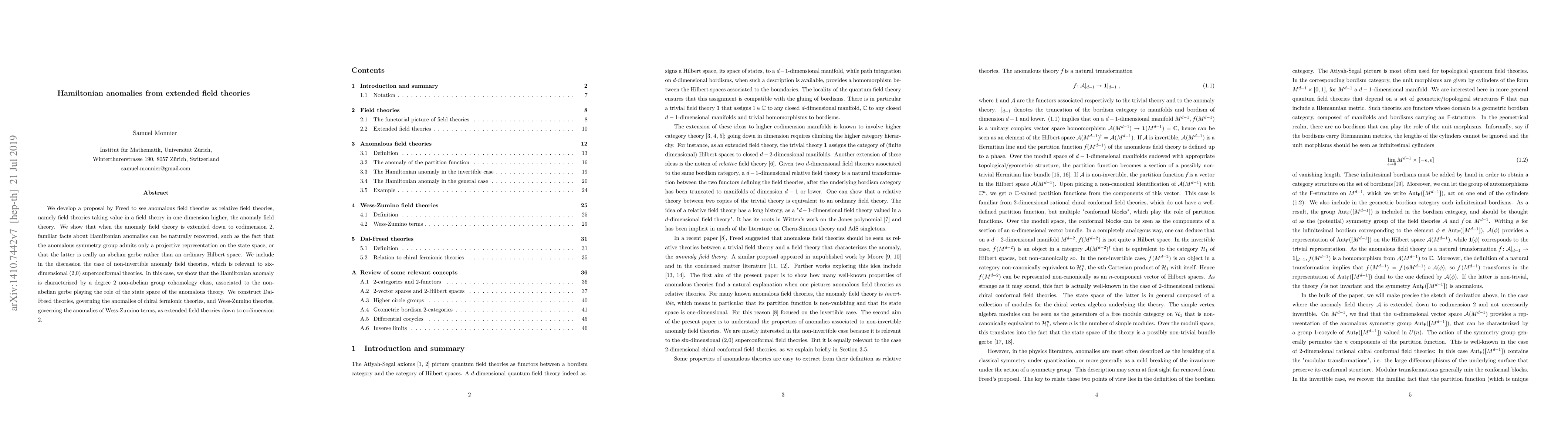 We develop a proposal by Freed to see anomalous field theories as relative field theories, namely field theories taking value in a field theory in one dimension higher, the anomaly field theory. We show that when the anomaly field theory is extended down to codimension 2, familiar facts about Hamiltonian anomalies can be naturally recovered, such as the fact that the anomalous symmetry group admits only a projective representation on the state space, or that the latter is really an abelian gerbe rather than an ordinary Hilbert space. We include in the discussion the case of non-invertible anomaly field theories, which is relevant to six-dimensional (2,0) superconformal theories. In this case, we show that the Hamiltonian anomaly is characterized by a degree 2 non-abelian group cohomology class, associated to the non-abelian gerbe playing the role of the state space of the anomalous theory. We construct Dai-Freed theories, governing the anomalies of chiral fermionic theories, and Wess-Zumino theories, governing the anomalies of Wess-Zumino terms, as extended field theories down to codimension 2.