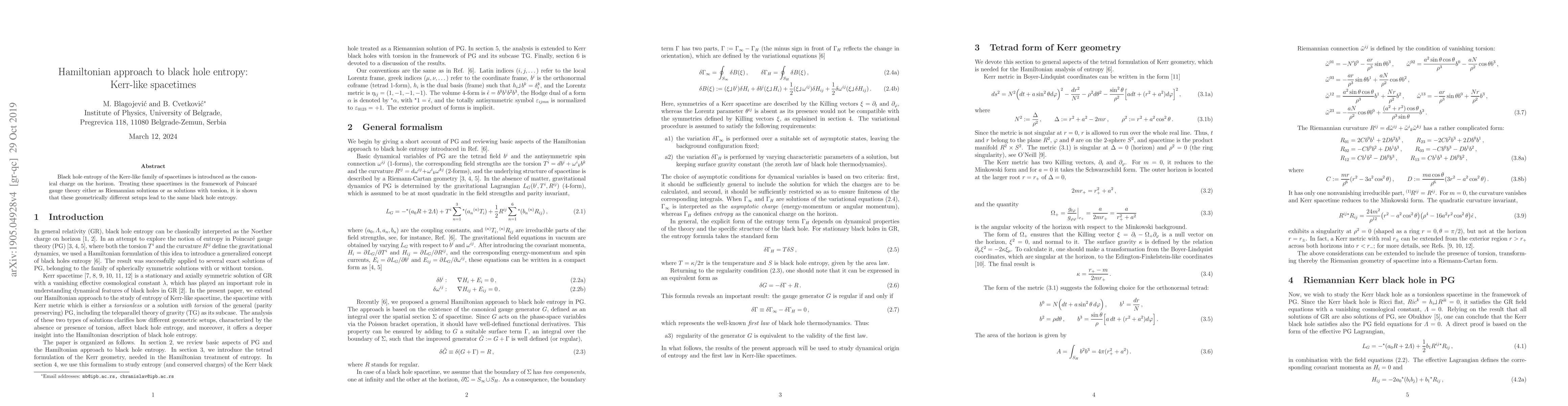 Researchers show that black hole entropy in Kerr-like spacetimes is equivalent whether treated as Riemannian solutions or with torsion in Poincaré gauge theory, leading to the same canonical charge on the horizon.