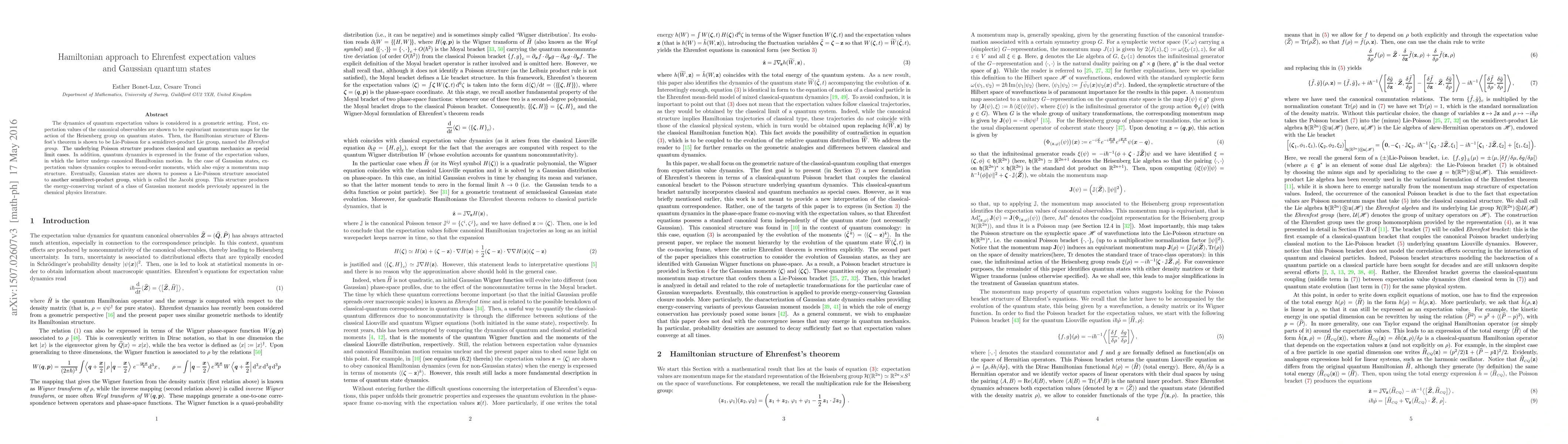 This paper explores the dynamics of quantum expectation values using a Hamiltonian approach, demonstrating that these values are equivariant momentum maps for the Heisenberg group. It further reveals a Lie-Poisson structure for the dynamics of Gaussian quantum states, linking them to a semidirect-product group called the Jacobi group.