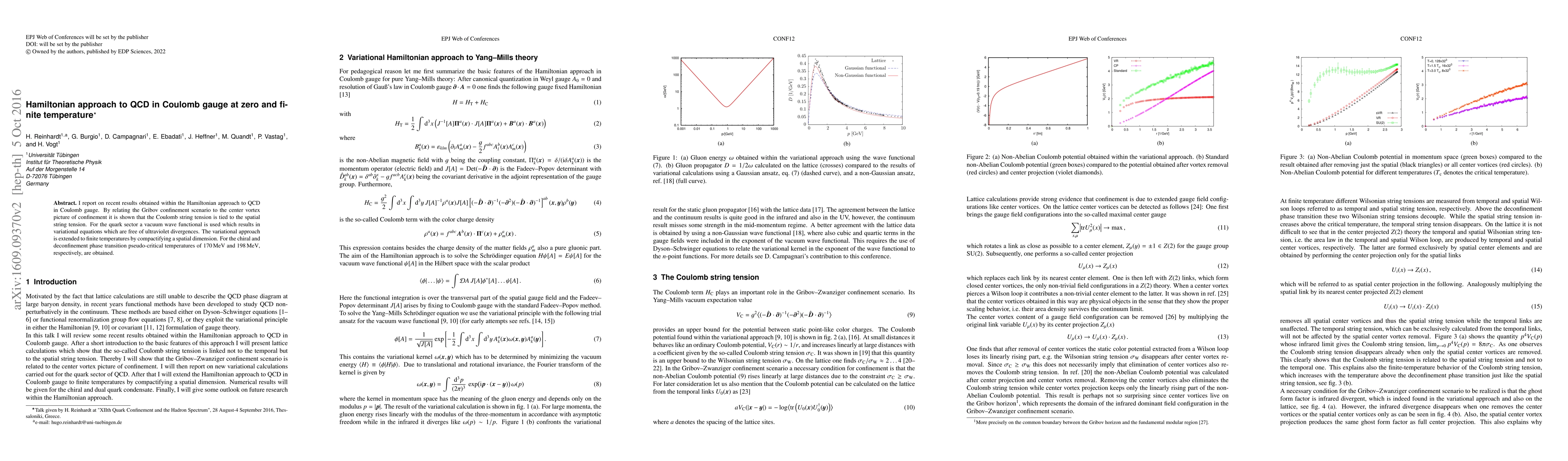 This paper explores QCD in Coulomb gauge using a Hamiltonian approach, linking Gribov confinement to the center vortex picture and showing a connection between Coulomb and spatial string tensions. It extends the variational method to finite temperatures, finding pseudo-critical temperatures for chiral and deconfinement transitions at 170 MeV and 198 MeV, respectively.