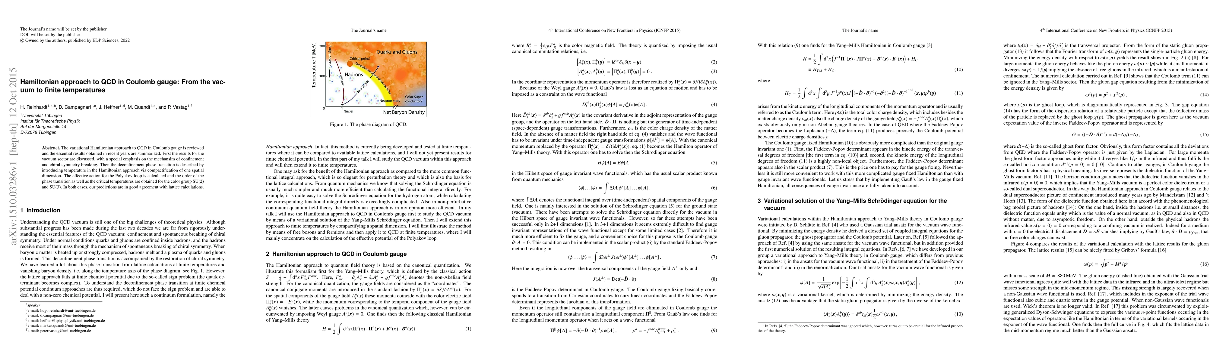 This paper reviews the Hamiltonian approach to QCD in Coulomb gauge, focusing on confinement and chiral symmetry breaking in the vacuum. It also explores the deconfinement phase transition at finite temperatures, calculating the effective action for the Polyakov loop and predicting critical temperatures for SU(2) and SU(3) in agreement with lattice calculations.
