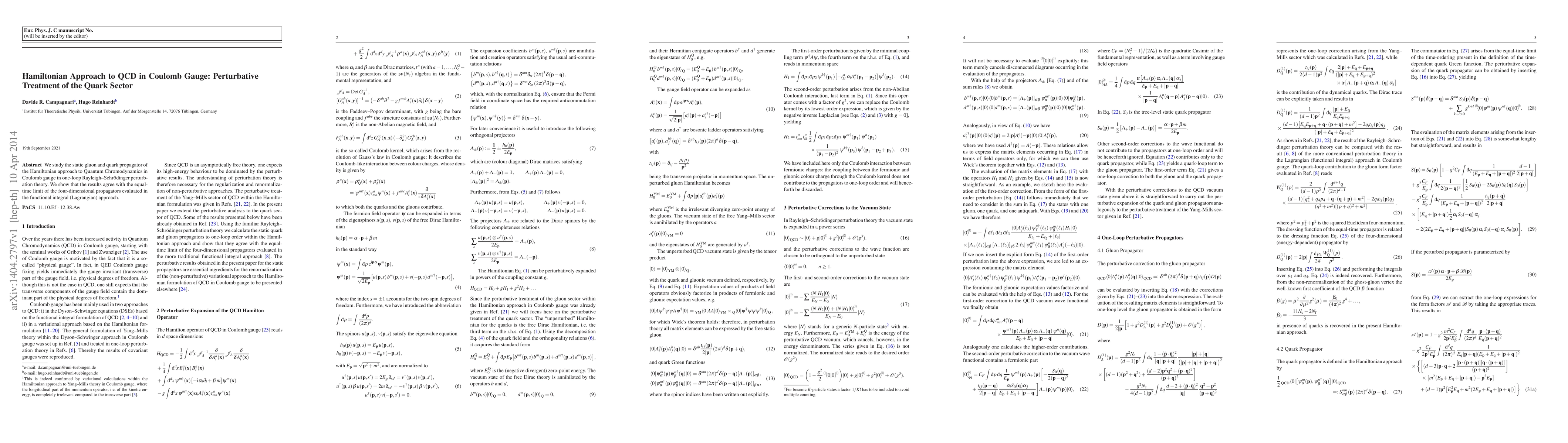 Summary: This study investigates the static gluon and quark propagators in Quantum Chromodynamics using the Hamiltonian approach in Coulomb gauge, confirming agreement with results from the functional integral method in one-loop perturbation theory. The focus is on the perturbative treatment of the quark sector.