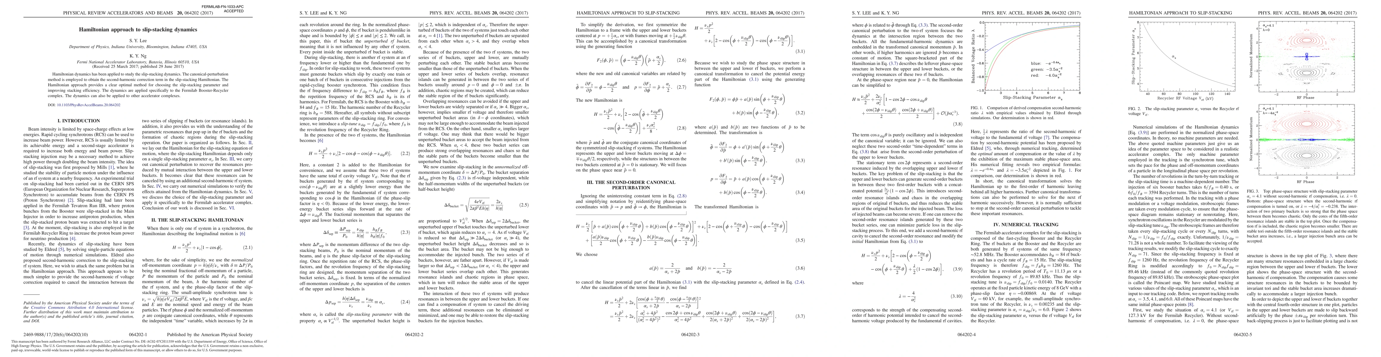 The research applies Hamiltonian dynamics and canonical-perturbation method to study slip-stacking in Fermilab Booster-Recycler complex, deriving a second-harmonic correction term. This approach optimizes slip-stacking parameters, enhancing efficiency, and is applicable to other accelerator complexes.