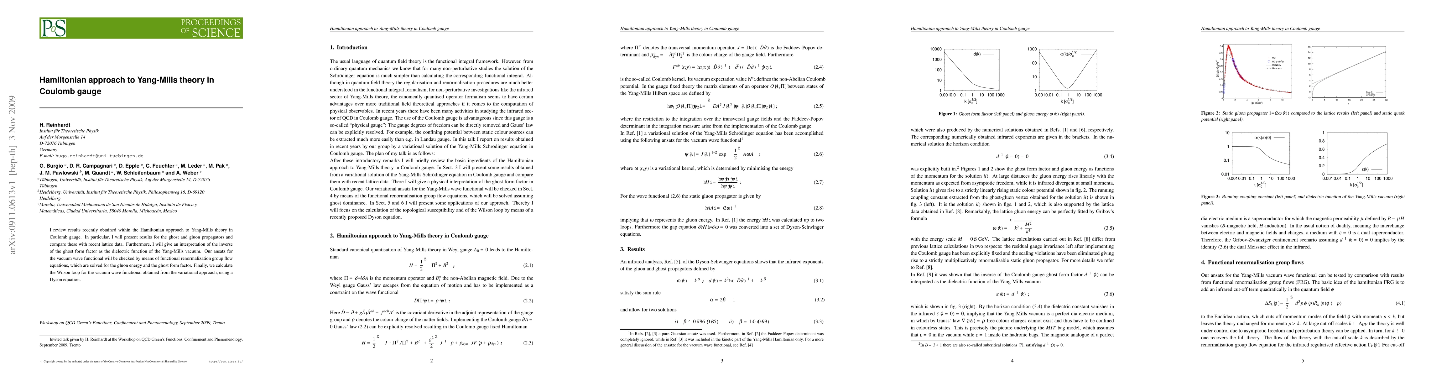 This paper reviews Hamiltonian formulations for Yang-Mills theory in Coulomb gauge, focusing on ghost and gluon propagators, and compares them to lattice data. It interprets the inverse ghost form factor as the Yang-Mills vacuum dielectric function, validates the vacuum wave functional via functional renormalization group, and calculates the Wilson loop with a Dyson equation.