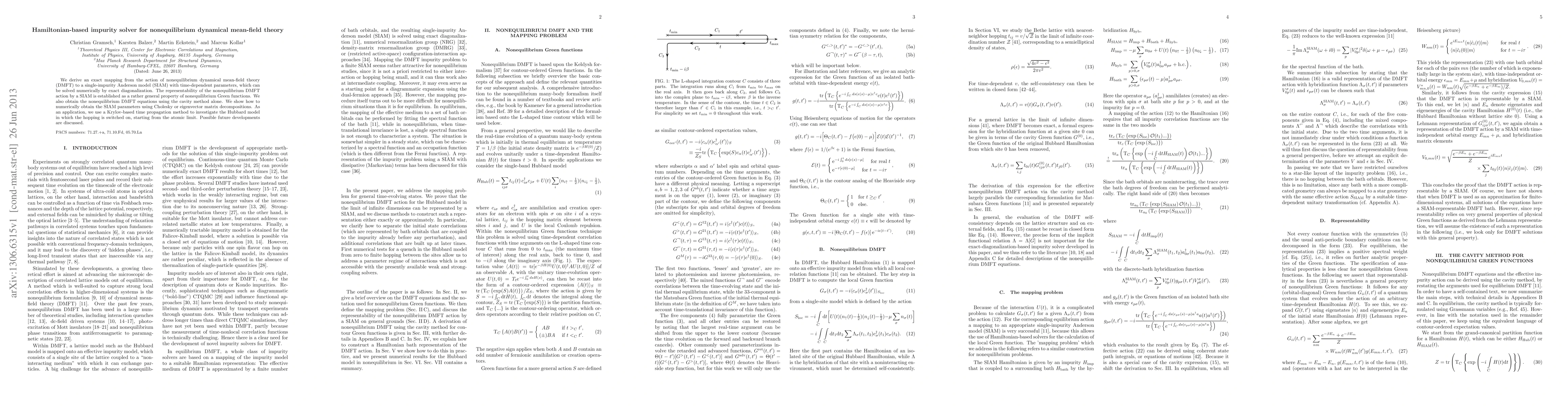 This paper presents a Hamiltonian-based impurity solver for nonequilibrium dynamical mean-field theory (DMFT) by mapping it to a time-dependent single-impurity Anderson model (SIAM) solvable via exact diagonalization. The study also explores the application of this method to the Hubbard model with time-dependent hopping.