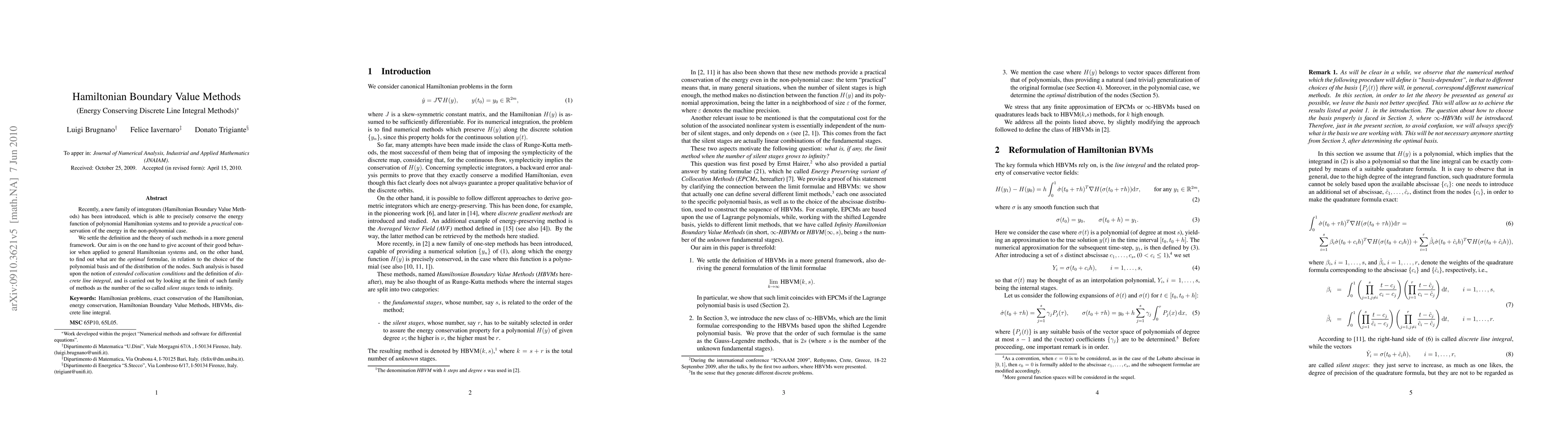 This paper introduces Hamiltonian Boundary Value Methods, a new class of integrators that precisely conserve energy in polynomial Hamiltonian systems and practically conserve it in non-polynomial cases. The authors develop a theoretical framework to analyze these methods, focusing on optimal formulae based on polynomial basis and node distribution, using extended collocation conditions and discrete line integrals.