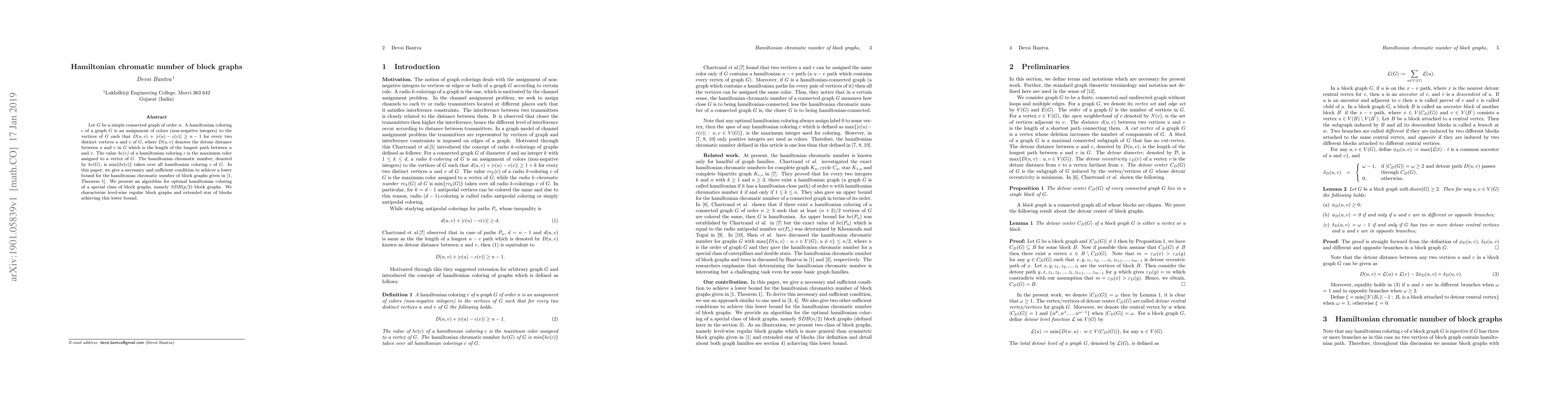 Let $G$ be a simple connected graph of order $n$. A hamiltonian coloring $c$ of a graph $G$ is an assignment of colors (non-negative integers) to the vertices of $G$ such that $D(u, v)$ + $|c(u) - c(v)|$ $\geq$ $n - 1$ for every two distinct vertices $u$ and $v$ of $G$, where $D(u, v)$ denotes the detour distance between $u$ and $v$ in $G$ which is the length of the longest path between $u$ and $v$. The value \emph{hc(c)} of a hamiltonian coloring $c$ is the maximum color assigned to a vertex of $G$. The hamiltonian chromatic number, denoted by $hc(G)$, is min\{$hc(c)$\} taken over all hamiltonian coloring $c$ of $G$. In this paper, we give a necessary and sufficient condition to achieve a lower bound for the hamiltonian chromatic number of block graphs given in [Theorem 1,On Hamiltonian Colorings of Block graphs, In: Kaykobad, M., Petrechi, R., (eds.) WALCOM: Algorithms and Computation, LNCS: 9627, 28-39, 2016]. We present an algorithm for optimal hamiltonian coloring of a special class of block graphs, namely $SDB(p/2)$ block graphs. We characterize level-wise regular block graphs and extended star of blocks achieving this lower bound.