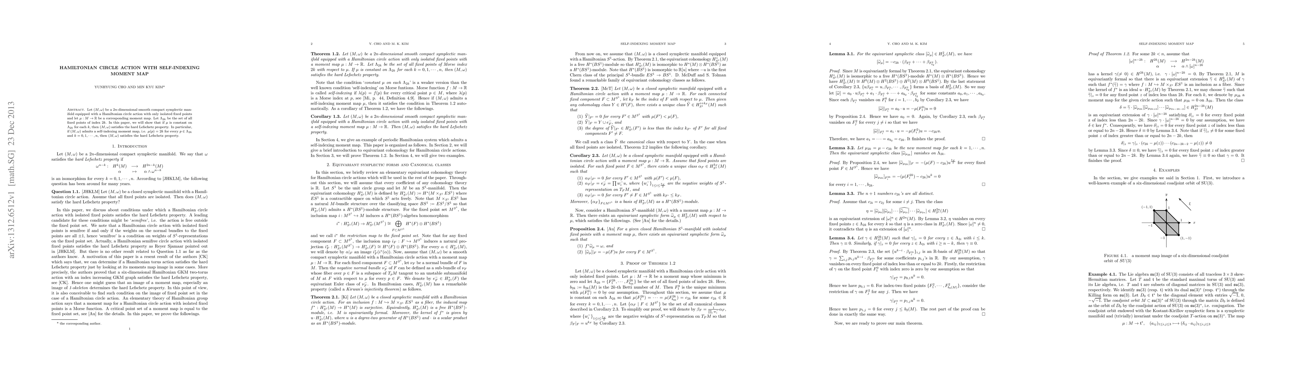 A symplectic manifold with a Hamiltonian circle action and a constant moment map satisfies the hard Lefschetz property if its fixed points have even indices, implying a self-indexing moment map leads to this result.