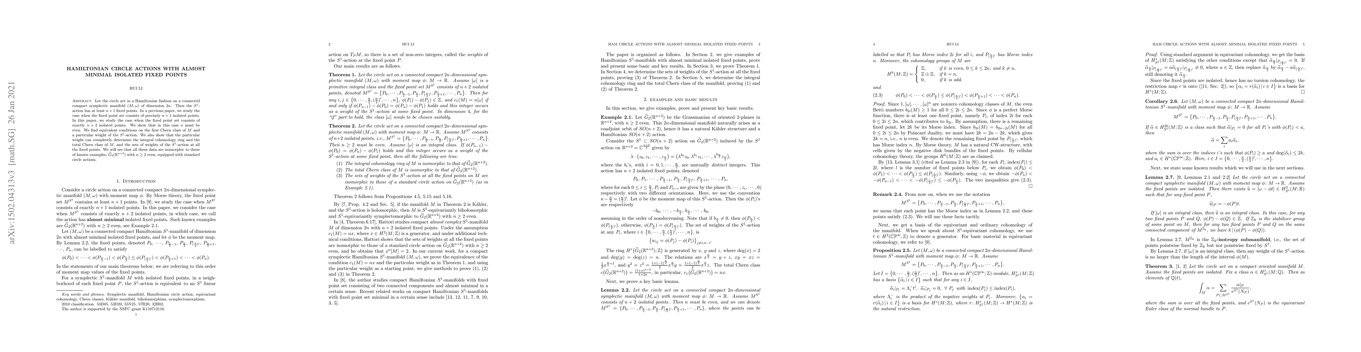 This paper investigates Hamiltonian circle actions on compact symplectic manifolds where the fixed point set comprises exactly $n+2$ isolated points, proving that $n$ must be even. It establishes conditions on the first Chern class and a specific weight of the $S^1$-action, showing these determine the integral cohomology ring and total Chern class, aligning with known examples like $\widetilde{G}_2(\mathbb{R}^{n+2})$ for even $n$.