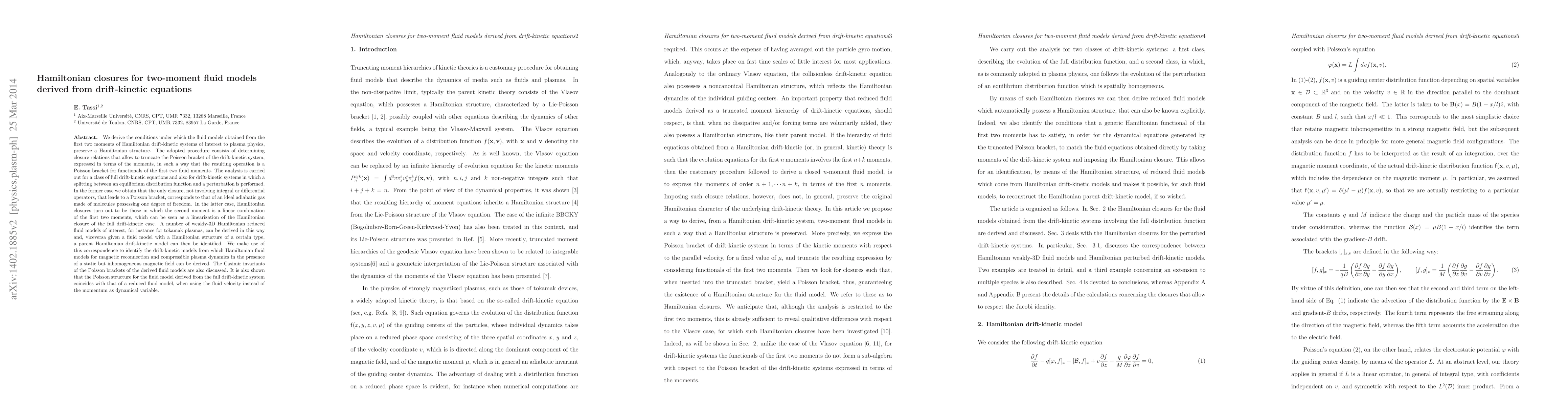 This paper derives Hamiltonian closures for two-moment fluid models derived from drift-kinetic equations, ensuring they preserve a Hamiltonian structure. It identifies closures for both full drift-kinetic and split systems, leading to models applicable to tokamak plasmas and magnetic reconnection.