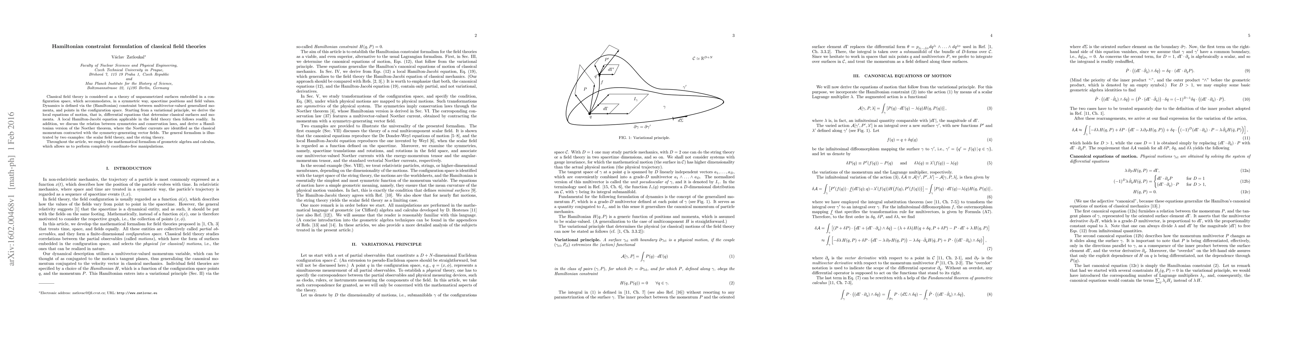 This paper formulates classical field theories using a Hamiltonian constraint approach, defining dynamics through a constraint between generalized momenta and configuration space points. It derives local equations of motion and a Hamilton-Jacobi equation, and discusses the connection between symmetries and conservation laws, illustrating the formalism with scalar and string field theories.