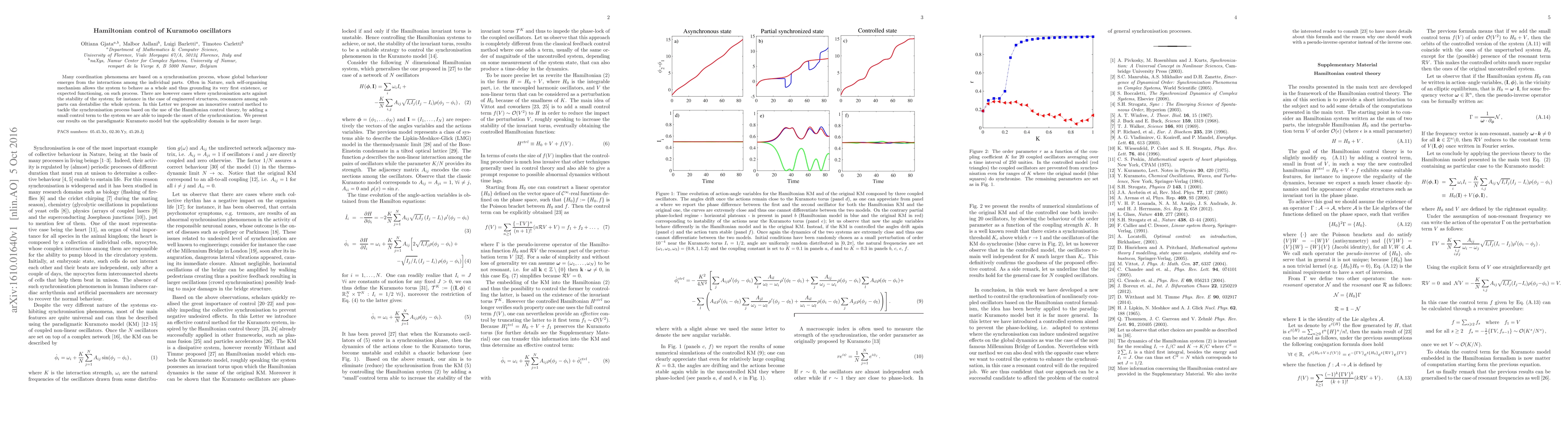 Many coordination phenomena are based on a synchronisation process, whose global behaviour emerges from the interactions among the individual parts. Often in Nature, such self-organising mechanism allows the system to behave as a whole and thus grounding its very first existence, or expected functioning, on such process. There are however cases where synchronisation acts against the stability of the system; for instance in the case of engineered structures, resonances among sub parts can destabilise the whole system. In this Letter we propose an innovative control method to tackle the synchronisation process based on the use of the Hamiltonian control theory, by adding a small control term to the system we are able to impede the onset of the synchronisation. We present our results on the paradigmatic Kuramoto model but the applicability domain is far more large.