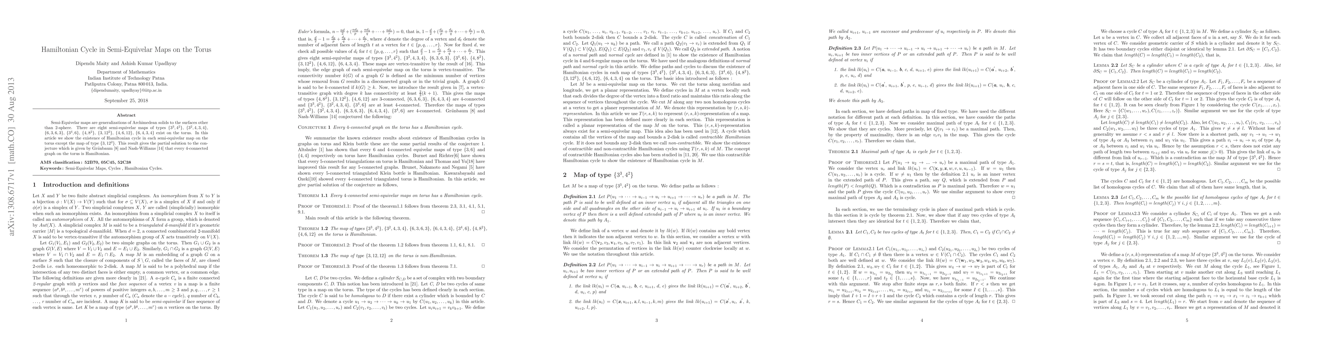 This paper investigates Hamiltonian cycles in semi-equivelar maps on the torus, demonstrating the existence of such cycles in all but one type, thus partially supporting the conjecture by Grünbaum and Nash-Williams regarding Hamiltonian properties of 4-connected toroidal graphs.