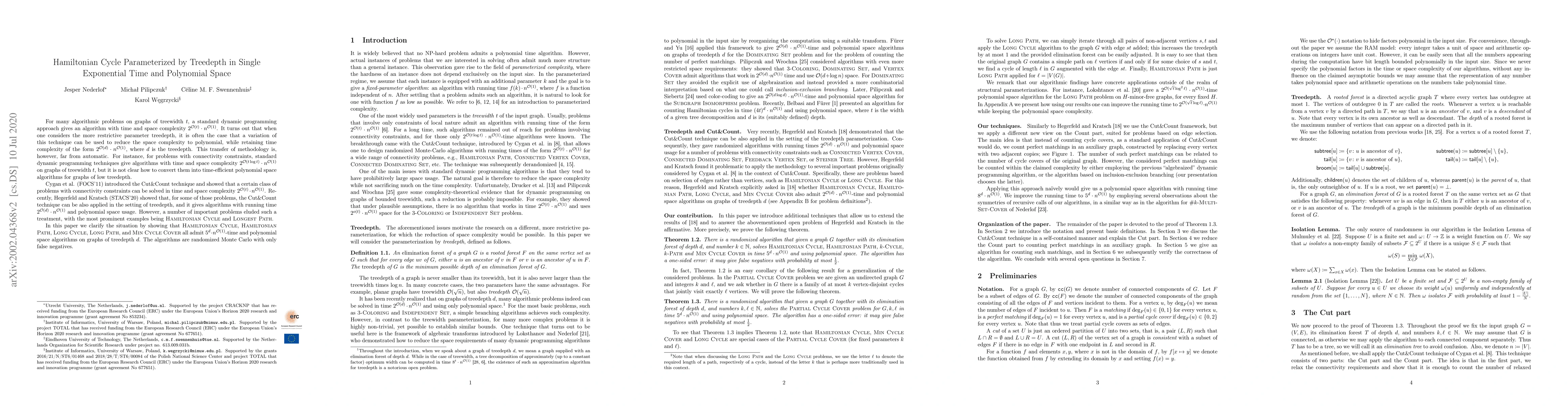 For many algorithmic problems on graphs of treewidth $t$, a standard dynamic programming approach gives an algorithm with time and space complexity $2^{\mathcal{O}(t)}\cdot n^{\mathcal{O}(1)}$. It turns out that when one considers the more restrictive parameter treedepth, it is often the case that a variation of this technique can be used to reduce the space complexity to polynomial, while retaining time complexity of the form $2^{\mathcal{O}(d)}\cdot n^{\mathcal{O}(1)}$, where $d$ is the treedepth. This transfer of methodology is, however, far from automatic. For instance, for problems with connectivity constraints, standard dynamic programming techniques give algorithms with time and space complexity $2^{\mathcal{O}(t\log t)}\cdot n^{\mathcal{O}(1)}$ on graphs of treewidth $t$, but it is not clear how to convert them into time-efficient polynomial space algorithms for graphs of low treedepth. Cygan et al. (FOCS'11) introduced the Cut&Count technique and showed that a certain class of problems with connectivity constraints can be solved in time and space complexity $2^{\mathcal{O}(t)}\cdot n^{\mathcal{O}(1)}$. Recently, Hegerfeld and Kratsch (STACS'20) showed that, for some of those problems, the Cut&Count technique can be also applied in the setting of treedepth, and it gives algorithms with running time $2^{\mathcal{O}(d)}\cdot n^{\mathcal{O}(1)}$ and polynomial space usage. However, a number of important problems eluded such a treatment, with the most prominent examples being Hamiltonian Cycle and Longest Path. In this paper we clarify the situation by showing that Hamiltonian Cycle, Hamiltonian Path, Long Cycle, Long Path, and Min Cycle Cover all admit $5^d\cdot n^{\mathcal{O}(1)}$-time and polynomial space algorithms on graphs of treedepth $d$. The algorithms are randomized Monte Carlo with only false negatives.