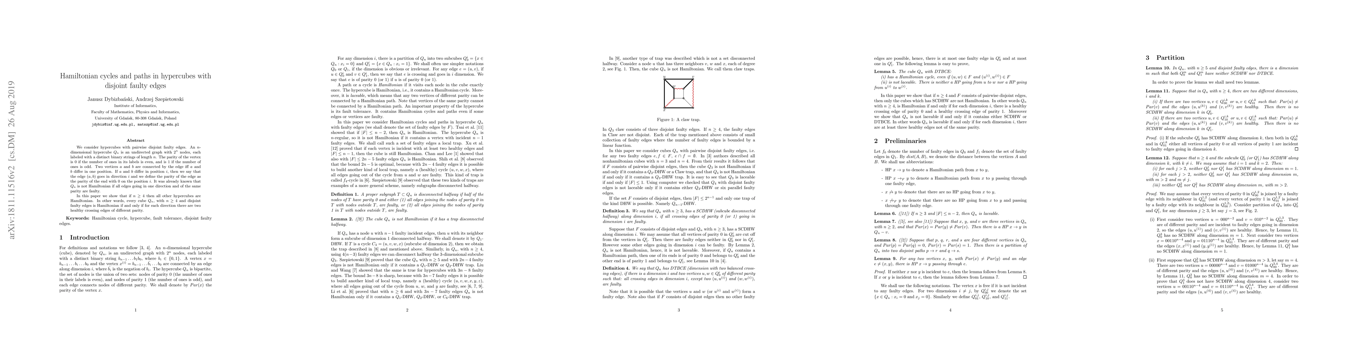 We consider hypercubes with pairwise disjoint faulty edges. An $n$-dimensional hypercube $Q_n$ is an undirected graph with $2^n$ nodes, each labeled with a distinct binary strings of length $n$. The parity of the vertex is 0 if the number of ones in its labels is even, and is 1 if the number of ones is odd. Two vertices $a$ and $b$ are connected by the edge iff $a$ and $b$ differ in one position. If $a$ and $b$ differ in position $i$, then we say that the edge $(a,b)$ goes in direction $i$ and we define the parity of the edge as the parity of the end with 0 on the position $i$. It was already known that $Q_n$ is not Hamiltonian if all edges going in one direction and of the same parity are faulty. In this paper we show that if $n\ge4$ then all other hypercubes are Hamiltonian. In other words, every cube $Q_n$, with $n\ge4$ and disjoint faulty edges is Hamiltonian if and only if for each direction there are two healthy crossing edges of different parity.
