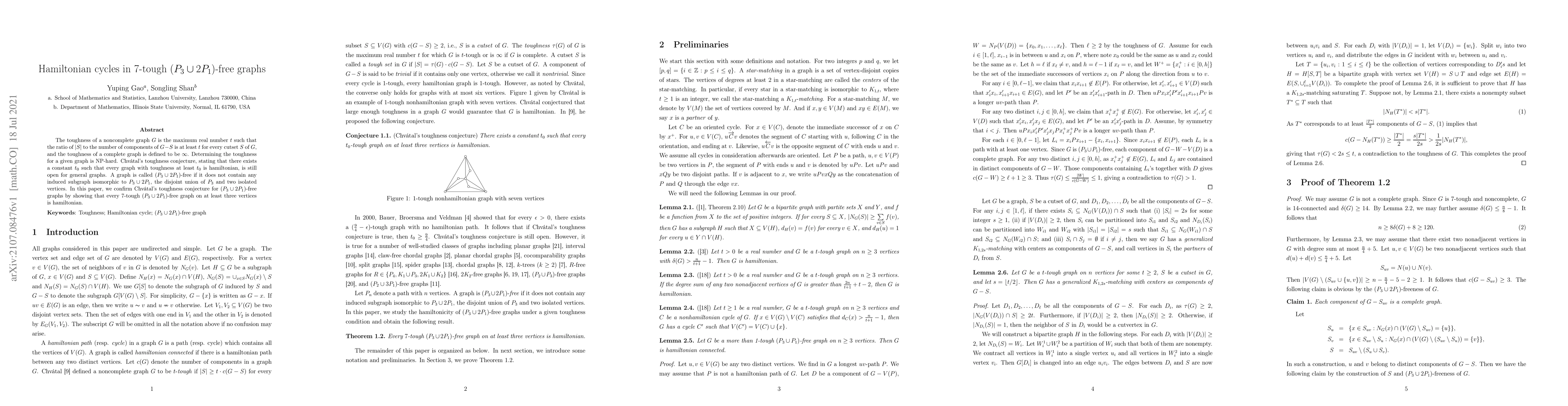 Researchers confirm Chv\u00e1tal's toughness conjecture for 7-tough $(P_3Â 2P_1)$-free graphs on at least three vertices, proving every graph of this type is hamiltonian.