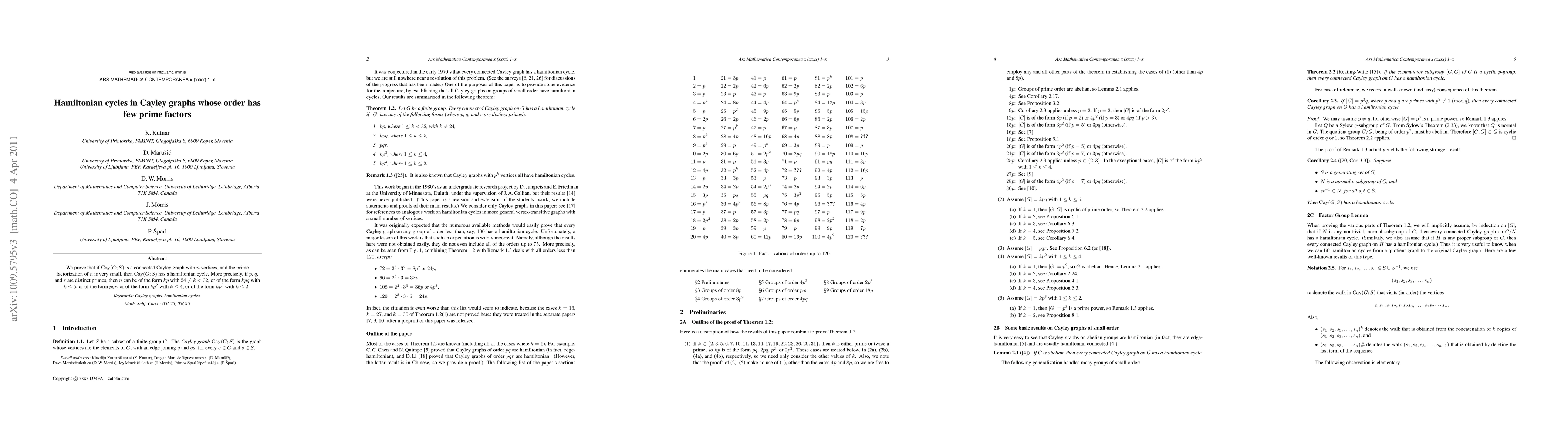 This paper proves that connected Cayley graphs with a small number of prime factors in their order possess Hamiltonian cycles. Specifically, it establishes conditions on the prime factorization of the graph's order that guarantee the existence of such cycles.