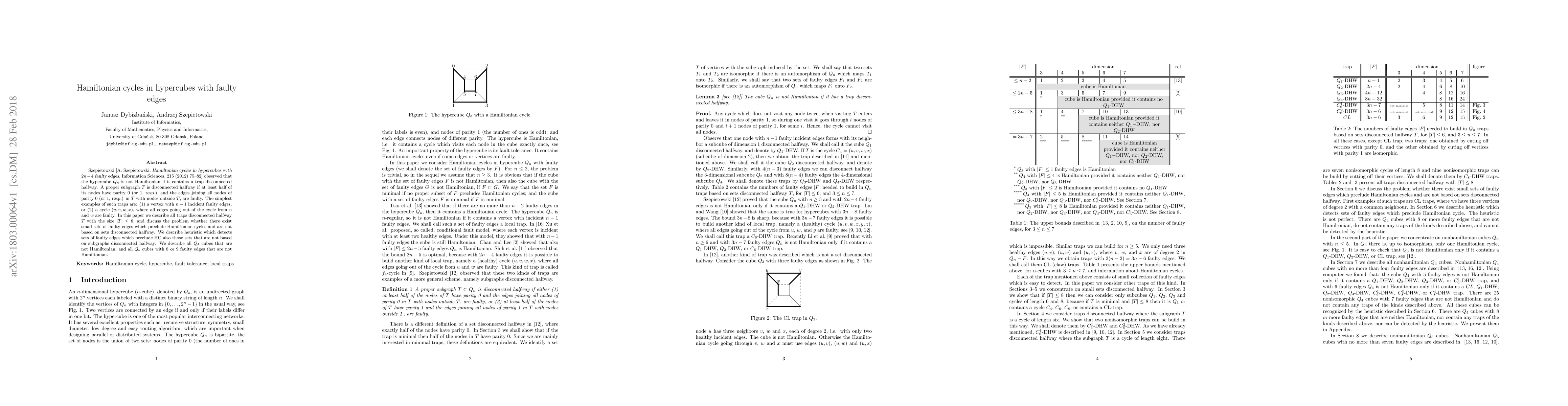 Szepietowski [A. Szepietowski, Hamiltonian cycles in hypercubes with $2n-4$ faulty edges, Information Sciences, 215 (2012) 75--82] observed that the hypercube $Q_n$ is not Hamiltonian if it contains a trap disconnected halfway. A proper subgraph $T$ is disconnected halfway if at least half of its nodes have parity 0 (or 1, resp.) and the edges joining all nodes of parity 0 (or 1, resp.) in $T$ with nodes outside $T$, are faulty. The simplest examples of such traps are: (1) a vertex with $n-1$ incident faulty edges, or (2) a cycle $(u,v,w,x)$, where all edges going out of the cycle from $u$ and $w$ are faulty. In this paper we describe all traps disconnected halfway $T$ with the size $|T|\le8$, and discuss the problem whether there exist small sets of faulty edges which preclude Hamiltonian cycles and are not based on sets disconnected halfway. We describe heuristic which detects sets of faulty edges which preclude HC also those sets that are not based on subgraphs disconnected halfway. We describe all $Q_4$ cubes that are not Hamiltonian, and all $Q_5$ cubes with 8 or 9 faulty edges that are not Hamiltonian.