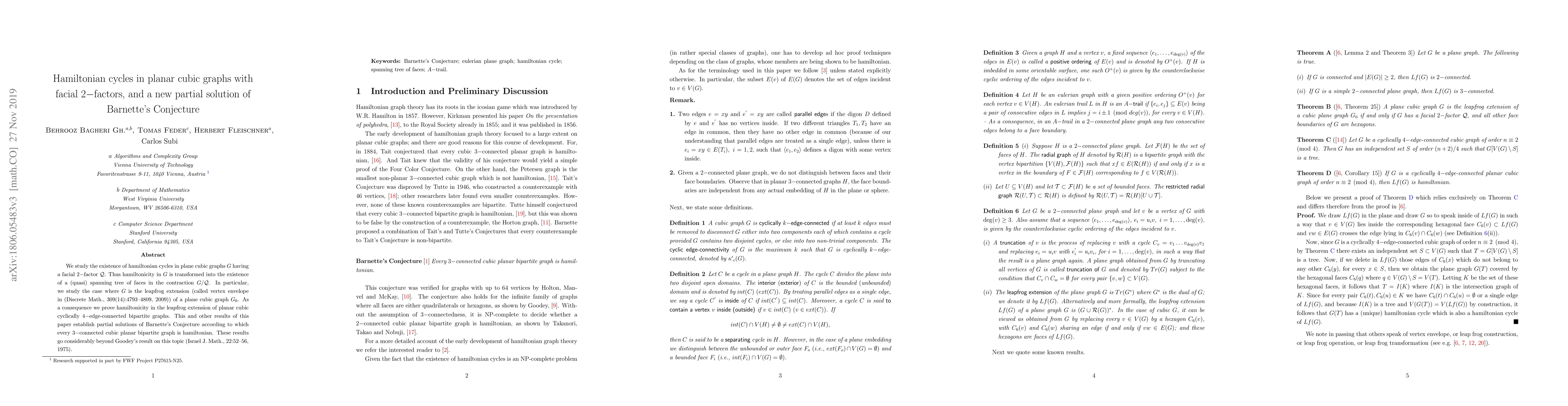 We study the existence of hamiltonian cycles in plane cubic graphs G having a facial 2-factor Q. Thus hamiltonicity in G is transformed into the existence of a (quasi) spanning tree of faces in the contraction G/Q. In particular, we study the case where G is the leapfrog extension (called vertex envelope in (Discrete Math., 309(14):4793-4809, 2009)) of a plane cubic graph G_0. As a consequence we prove hamiltonicity in the leapfrog extension of planar cubic cyclically 4-edge-connected bipartite graphs. This and other results of this paper establish partial solutions of Barnette's Conjecture according to which every 3-connected cubic planar bipartite graph is hamiltonian. These results go considerably beyond Goodey's result on this topic (Israel J. Math., 22:52-56, 1975).