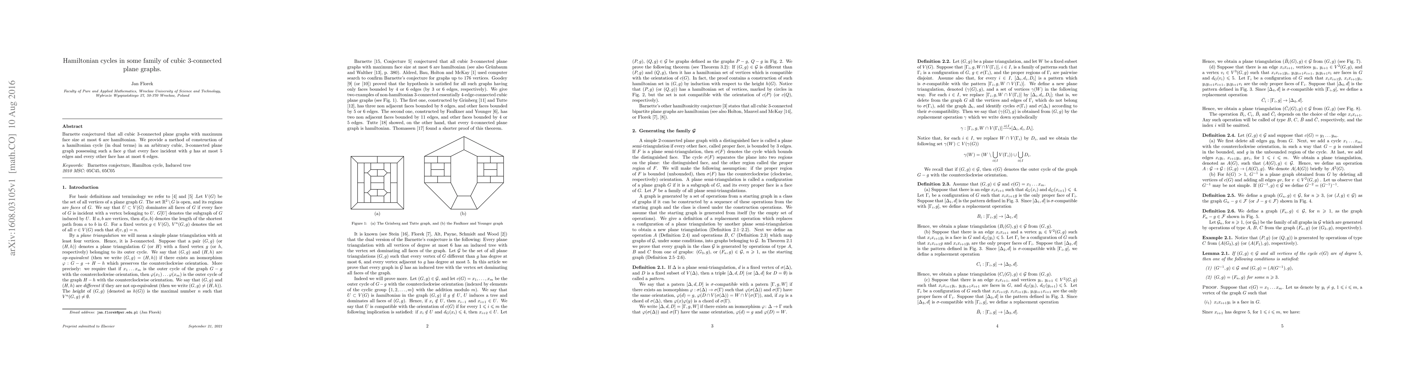 This paper confirms Barnette's conjecture for a specific subclass of cubic $3$-connected plane graphs, demonstrating a method to construct a Hamiltonian cycle in graphs where one face has at most $5$ edges and all others have at most $6$ edges. The construction is expressed in dual terms.