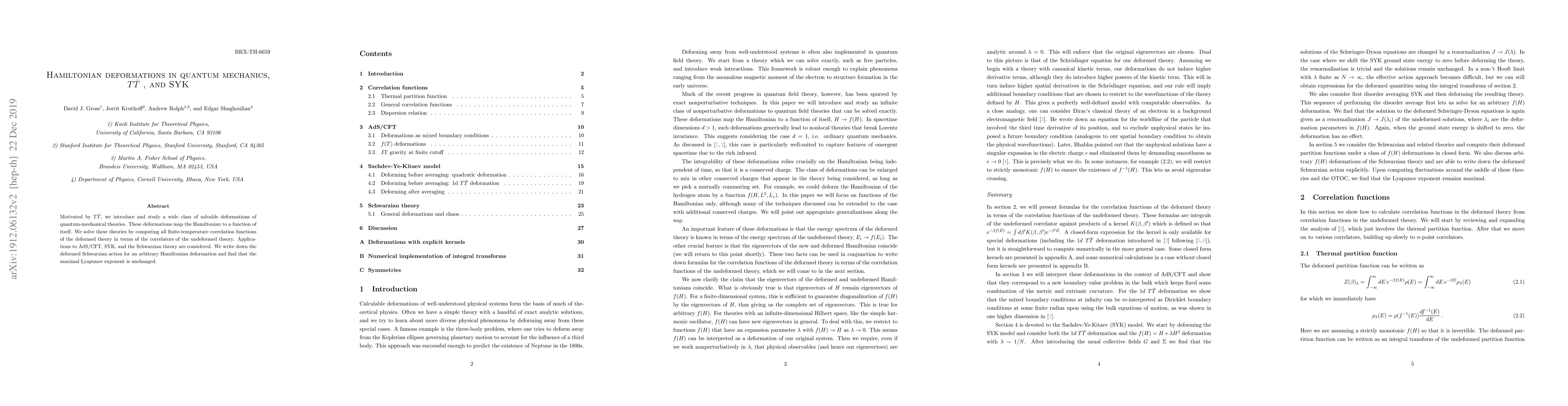 This paper explores a broad class of Hamiltonian deformations in quantum mechanics, particularly focusing on $T\bar T$ and SYK models. It solves these deformations by expressing finite-temperature correlation functions in terms of the undeformed theory's correlators, and finds that the maximal Lyapunov exponent remains unchanged under these deformations.