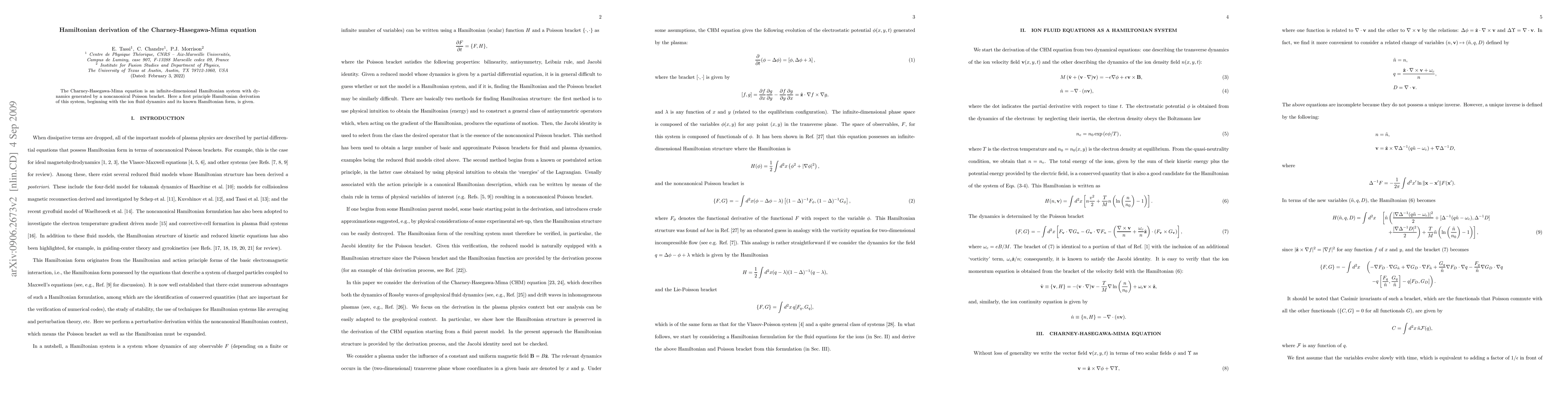 This paper presents a Hamiltonian derivation of the Charney-Hasegawa-Mima equation, starting from the ion fluid dynamics and its Hamiltonian form, establishing its dynamics through a noncanonical Poisson bracket.