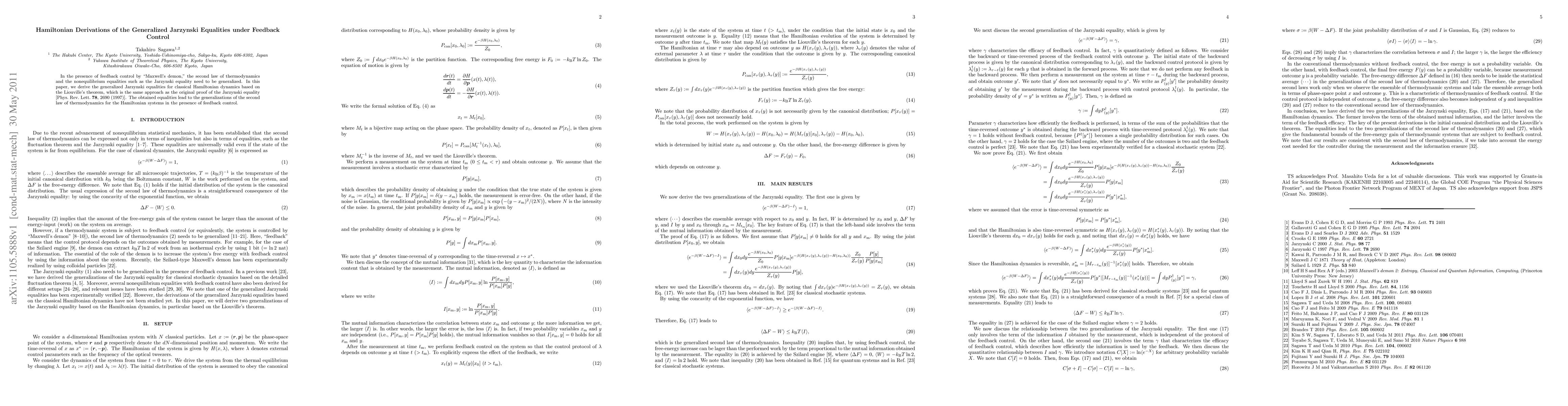 This paper derives generalized Jarzynski equalities for classical Hamiltonian dynamics under feedback control by Maxwell's demon, using Liouville's theorem. The results extend the second law of thermodynamics to Hamiltonian systems with feedback control.
