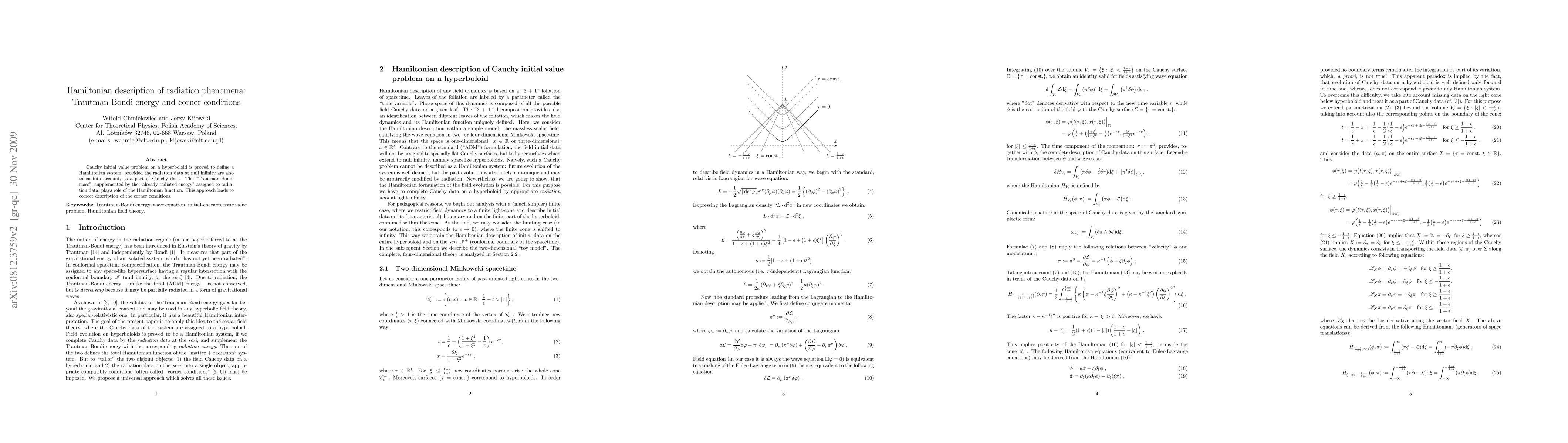 Cauchy initial value problem on a hyperboloid is proved to define a Hamiltonian system, provided the radiation data at null infinity are also taken into account, as a part of Cauchy data. The "Trautman-Bondi mass", supplemented by the "already radiated energy" assigned to radiation data, plays role of the Hamiltonian function. This approach leads to correct description of the corner conditions.