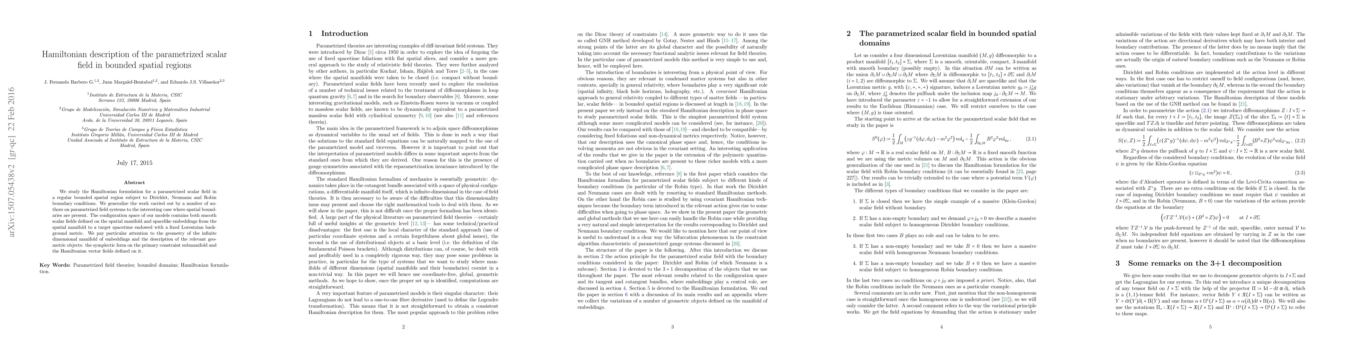This paper explores the Hamiltonian formulation for a parametrized scalar field in bounded spatial regions, considering Dirichlet, Neumann, and Robin boundary conditions. It focuses on the geometry of the infinite-dimensional manifold of embeddings and the symplectic form on the primary constraint submanifold.