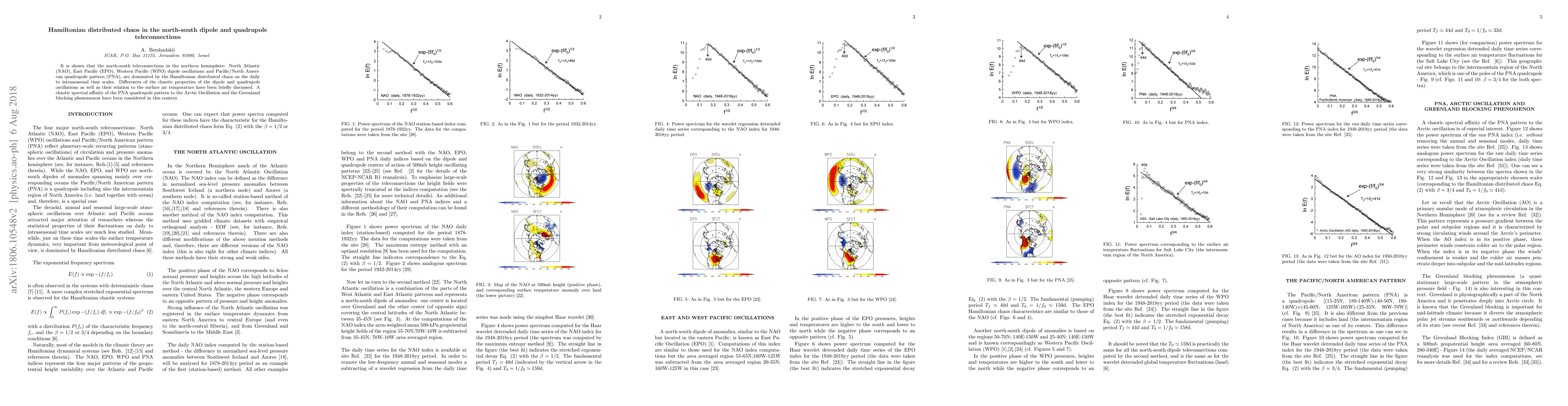 It is shown that the north-south teleconnections in the northern hemisphere: North Atlantic (NAO), East Pacific (EPO), Western Pacific (WPO) dipole oscillations and Pacific/North American quadrupole pattern (PNA), are dominated by the Hamiltonian distributed chaos on the daily to intraseasonal time scales. Differences of the chaotic properties of the dipole and quadrupole oscillations as well as their relation to the surface air temperature have been briefly discussed. A chaotic spectral affinity of the PNA quadrupole pattern to the Arctic Oscillation and the Greenland blocking phenomenon have been considered in this context.