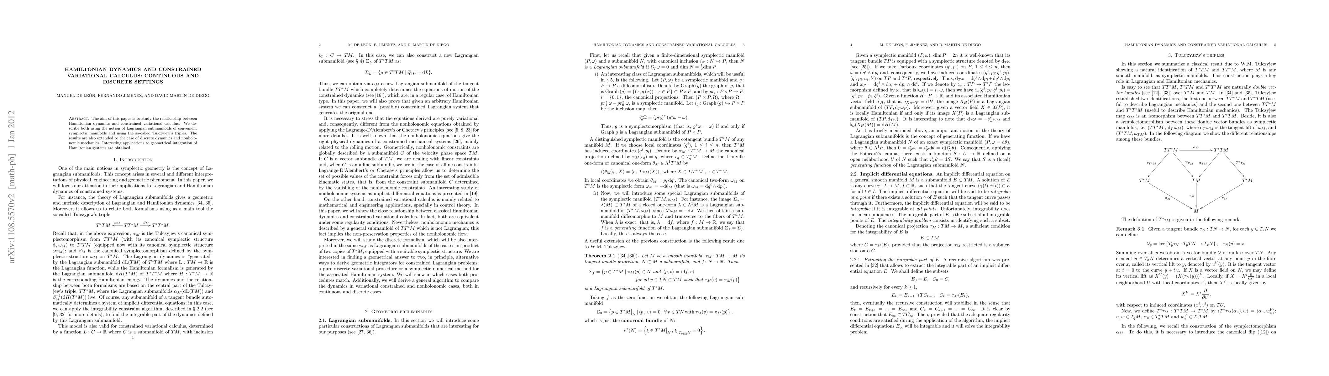 This paper investigates the connection between Hamiltonian dynamics and constrained variational calculus, employing Lagrangian submanifolds and Tulczyjew's triples. It extends findings to discrete dynamics and nonholonomic mechanics, with applications to the geometrical integration of Hamiltonian systems.