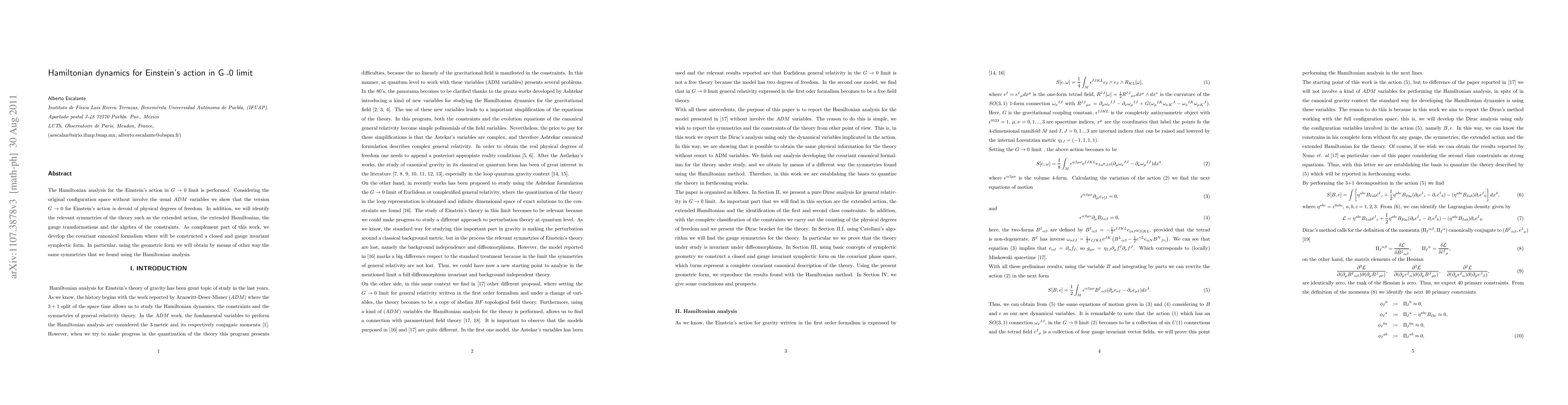 Researchers analyzed Einstein's action in the limit of general relativity (G) approaching zero and found it has no physical degrees of freedom, while developing a new canonical formalism to describe its symmetries.